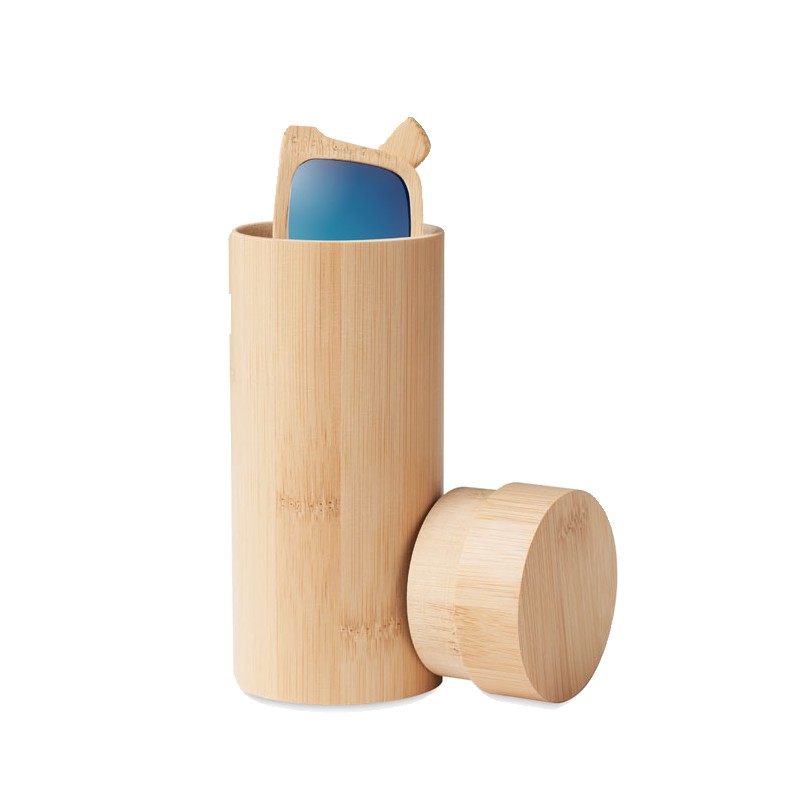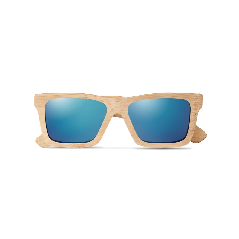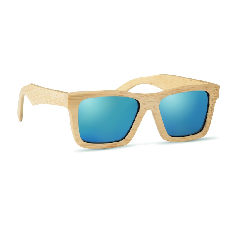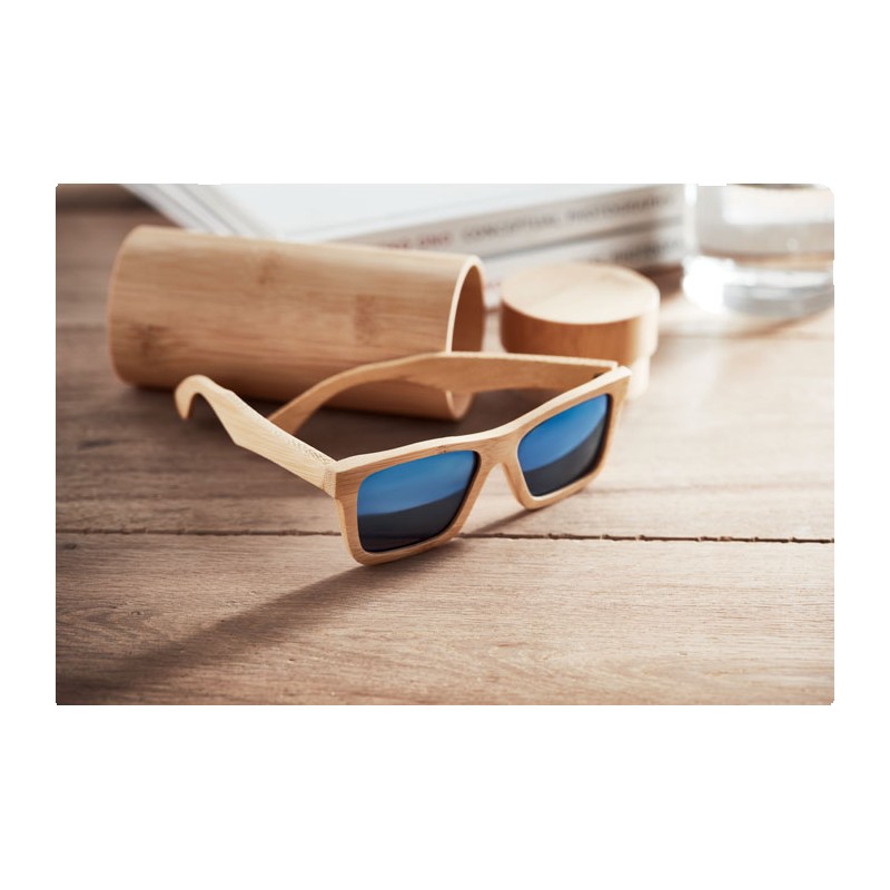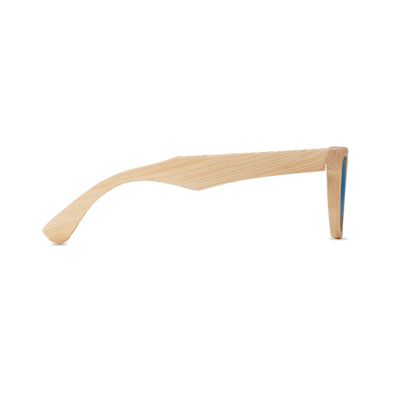 Lunettes de soleil entièrement en bambou avec des verres miroir colorés présentées dans un étui en bambou. Protection UV400. Le bambou est un produit naturel, et présente de légères variations de couleur, de décoration et de tailles.
