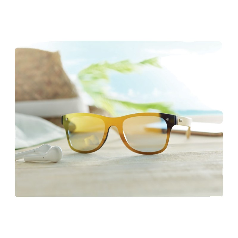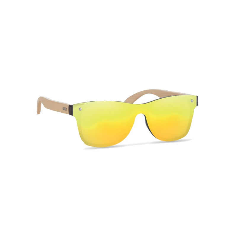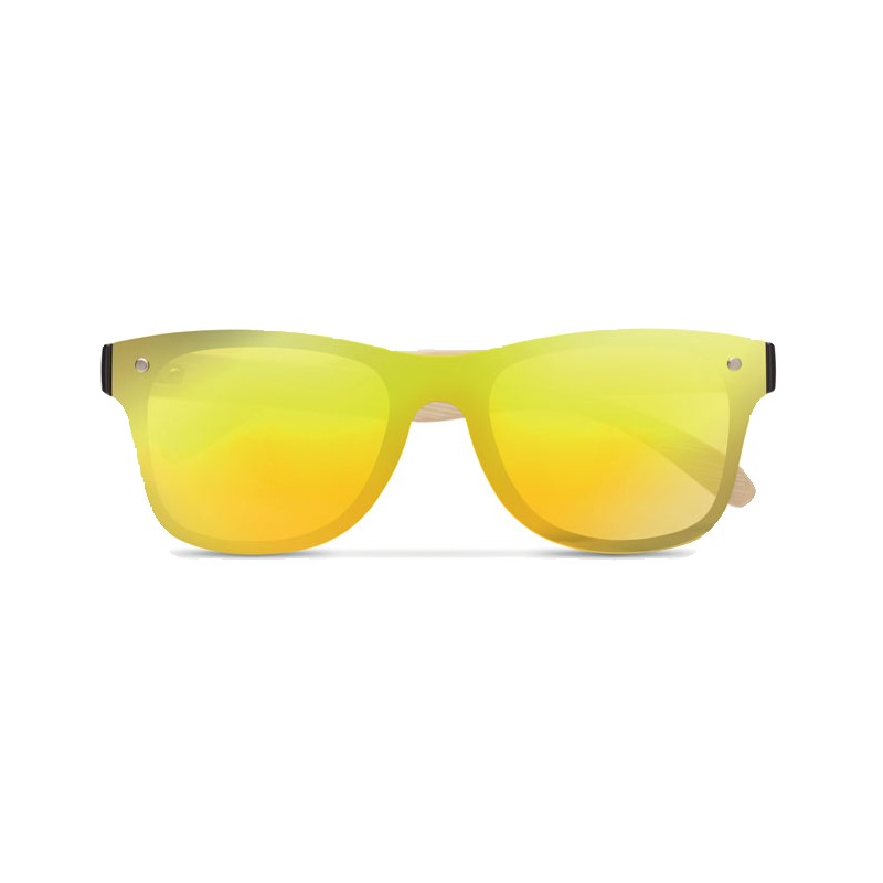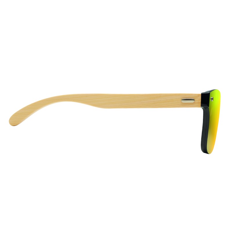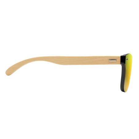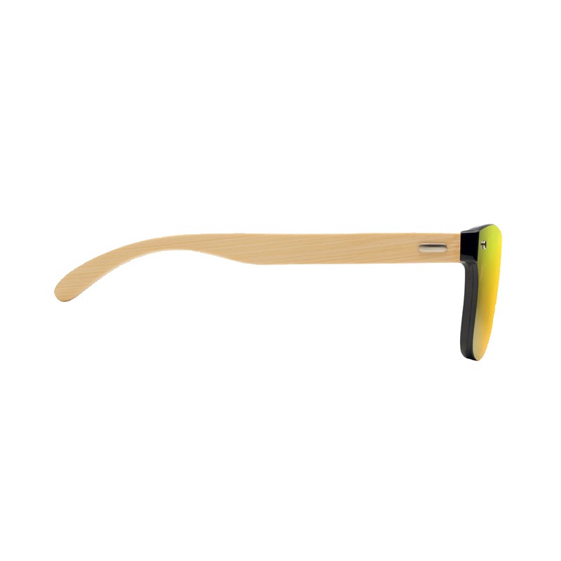 Lunettes de soleil avec branches en bambou et verre miroir. Protection UV400. Le bambou étant un matériau naturel, la couleur varie d’un article à l’autre.