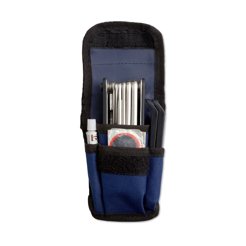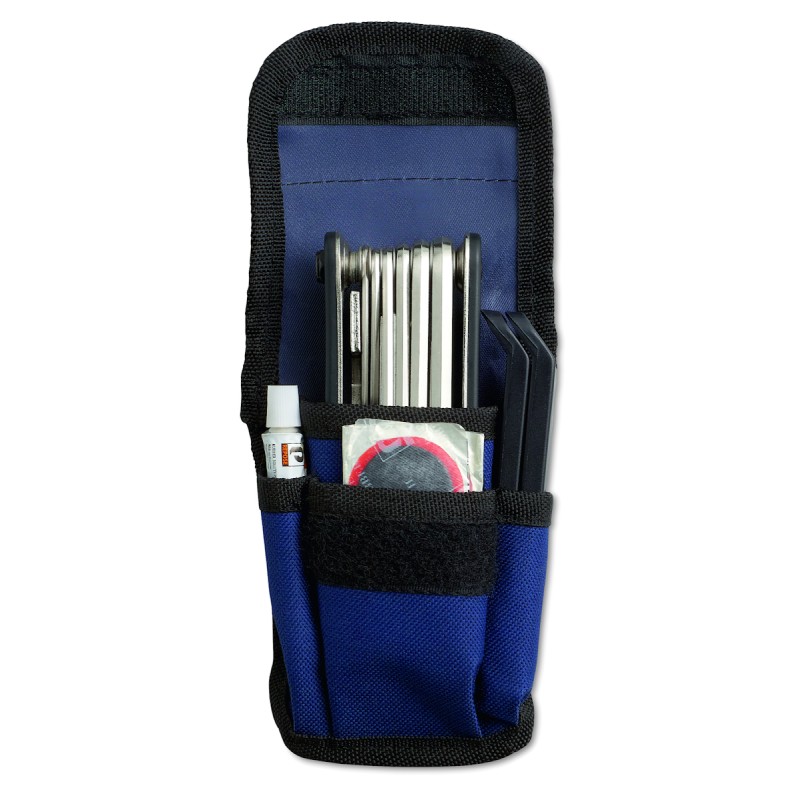 Kit de réparation pour vélo. Kit de 15 pièces composé de 2 démonte-pneus, râpe, colle et rustines incluant une pochette aux bandes réfléchissantes.