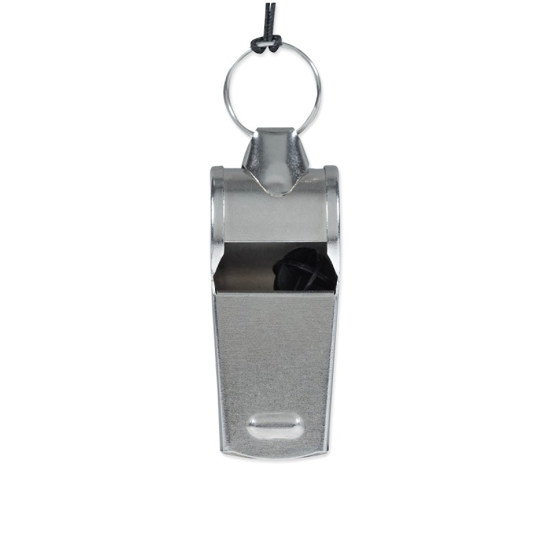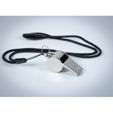 Sifflet en métal attaché à un cordon avec boucle de sécurité.