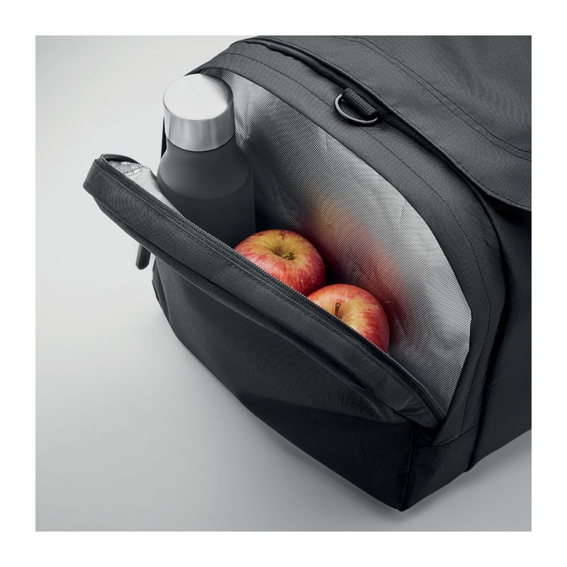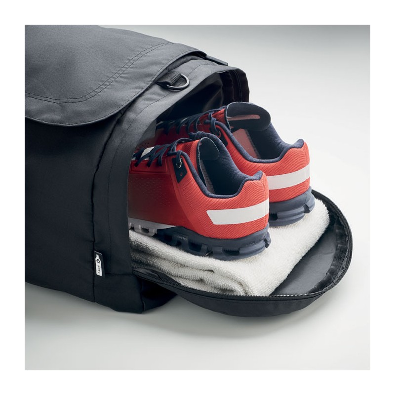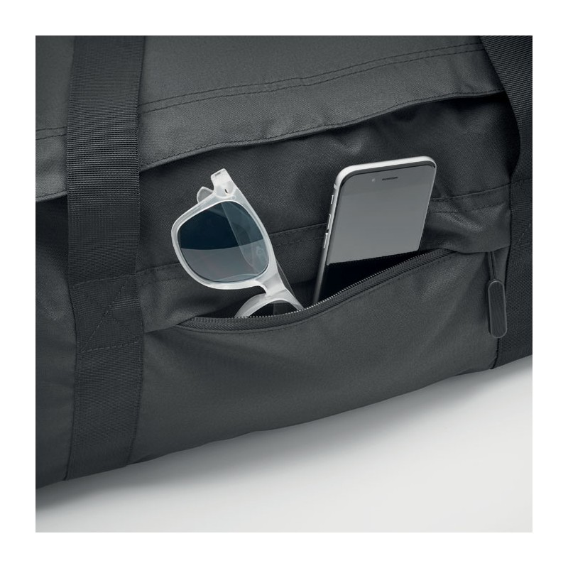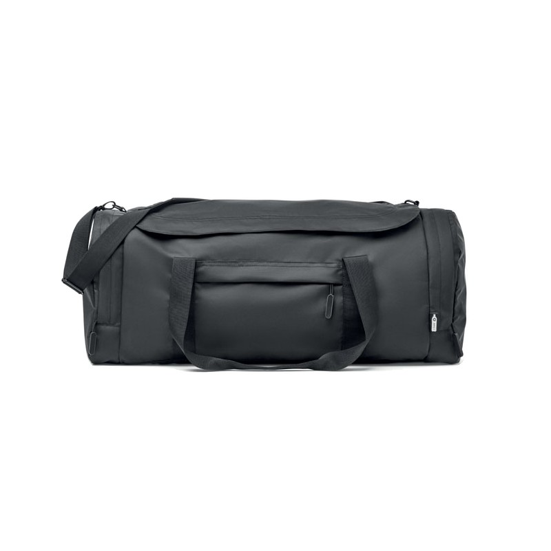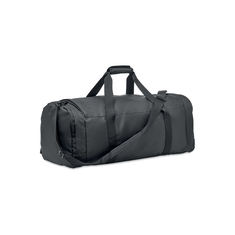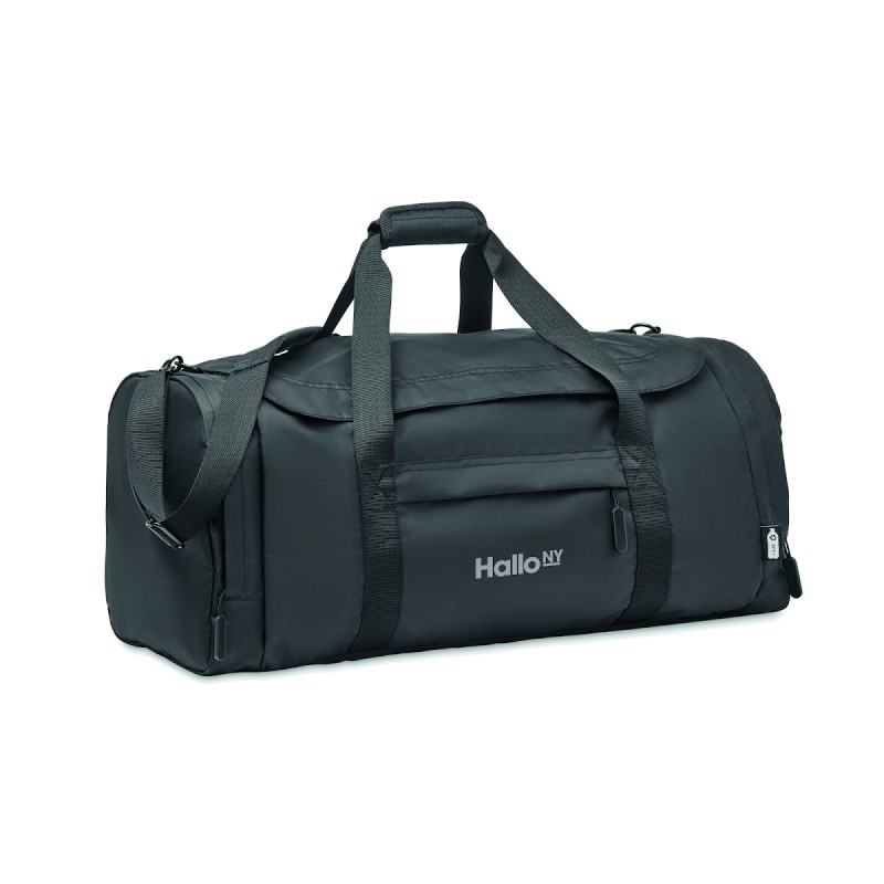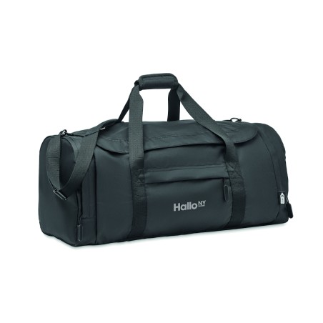 Grand sac de sport ou de voyage en polyester 300D RPET. Compartiment principal avec poches latérales zippées dont une isotherme. Renfort de fond amovible et bandoulière réglable, amovible.