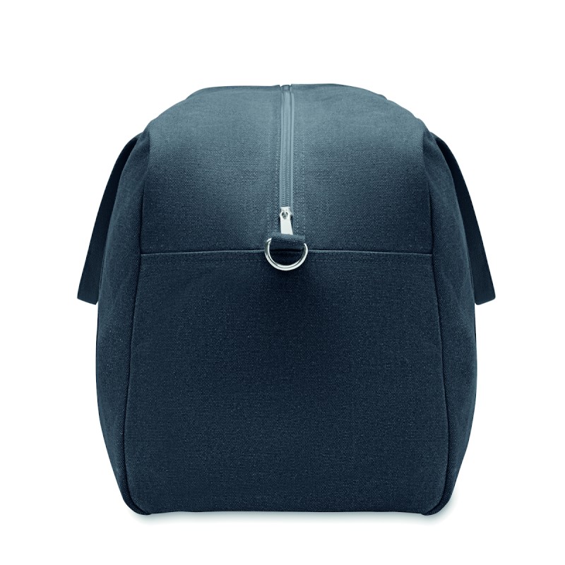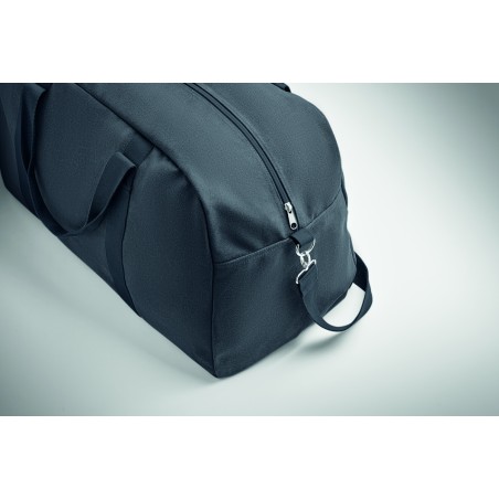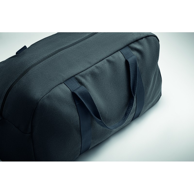 Sac de voyage en tissu recyclé de 450 gr/m² (60% coton recyclé et 40% polyester recyclé) avec sangle en coton réglable et détachable.