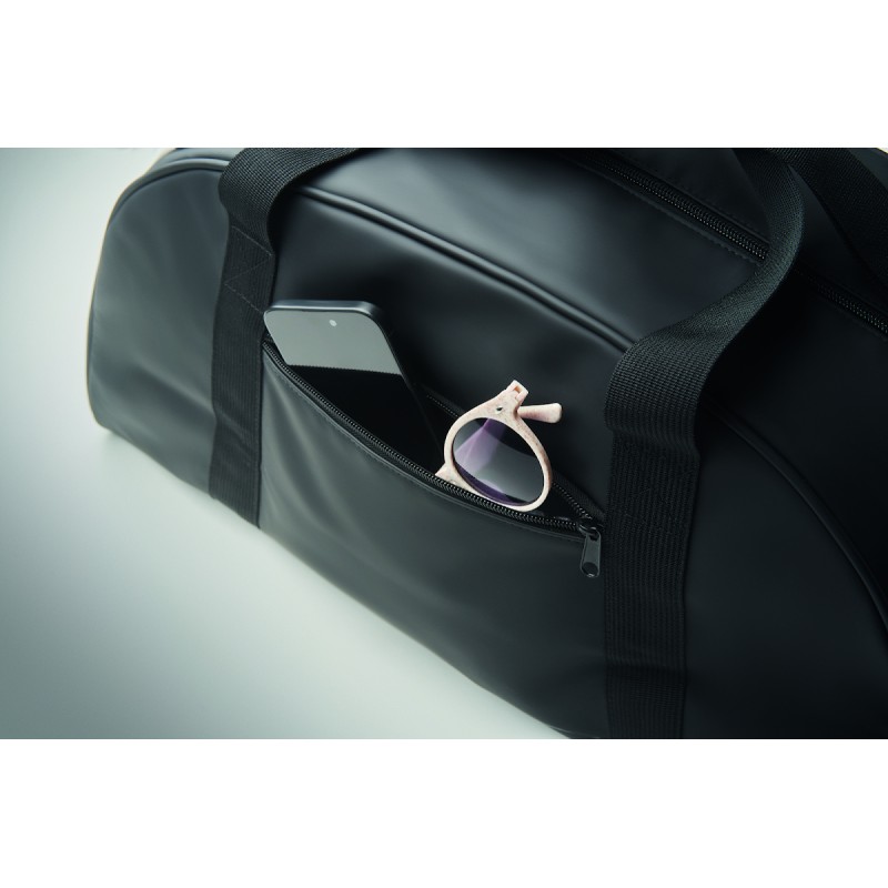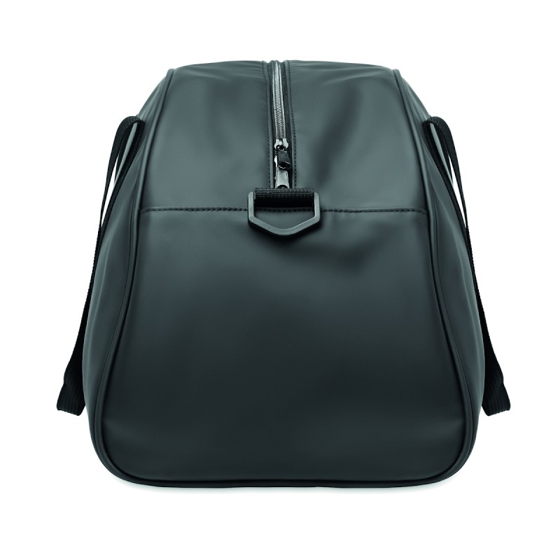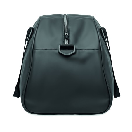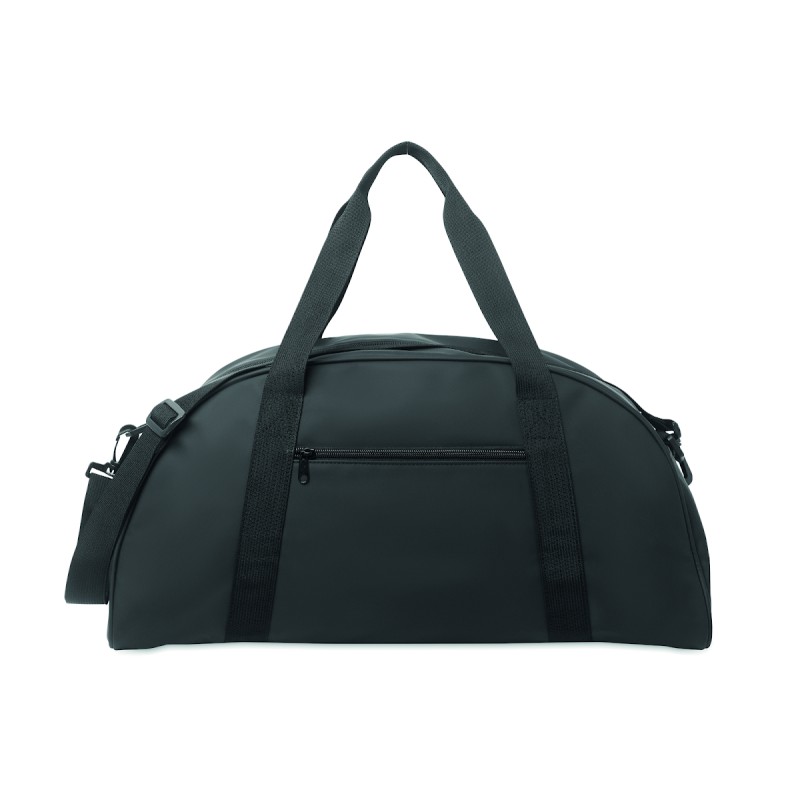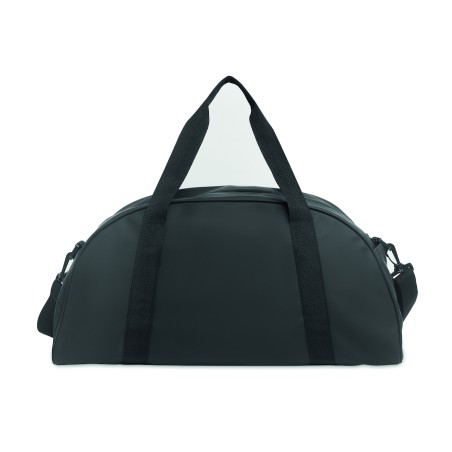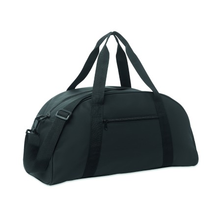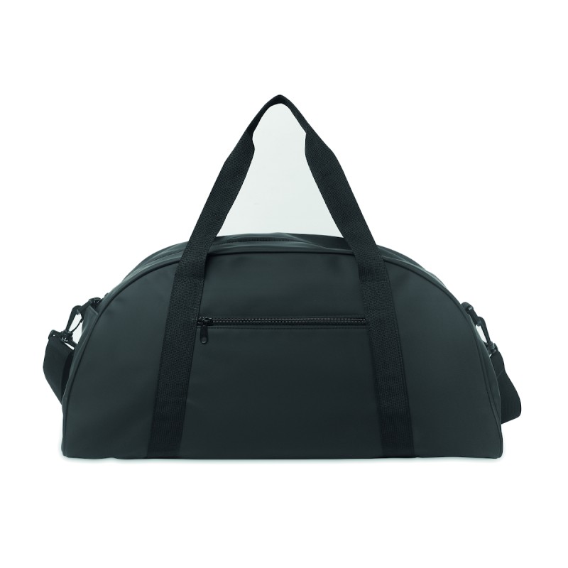 Sac de sport en PU souple avec renfort inférieur en mousse. Un compartiment principal, une poche frontale zippée et une poche intérieure zippée. doublure en polyester 210D RPET. 2 poignées et une bandoulière réglable et amovible