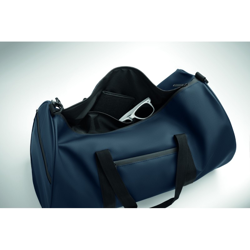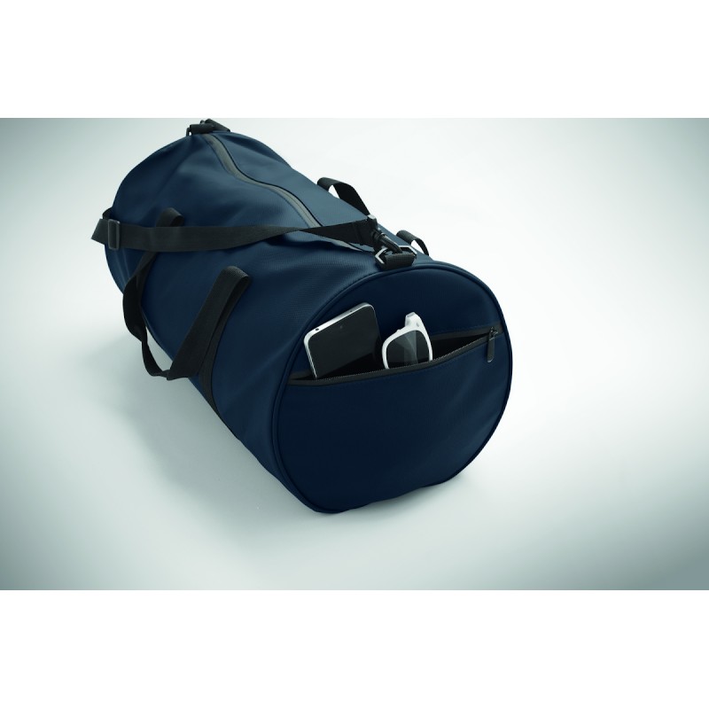 Sac de sport en polyester 600D RPET avec revêtement PU. Poche frontale zippée. Doublure intérieure en polyester 210D RPET. 1 compartiment latéral zippé / 1 compartiment latéral en filet. Poche intérieure zippée.