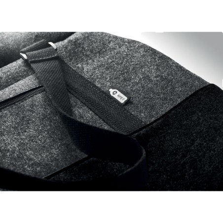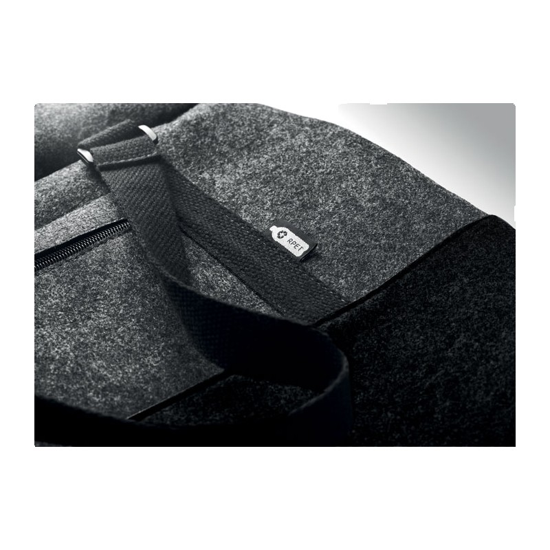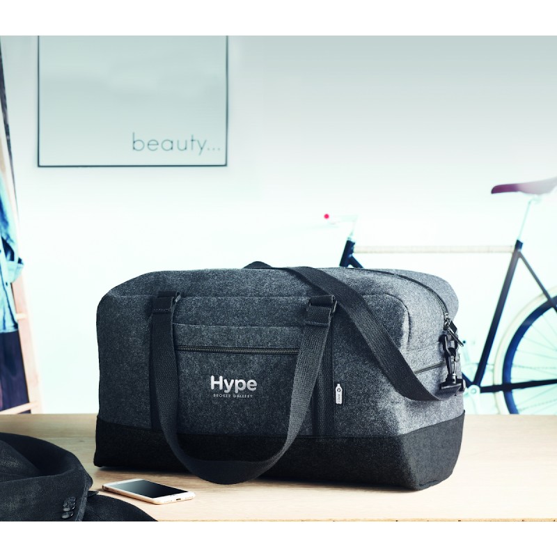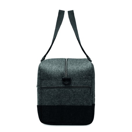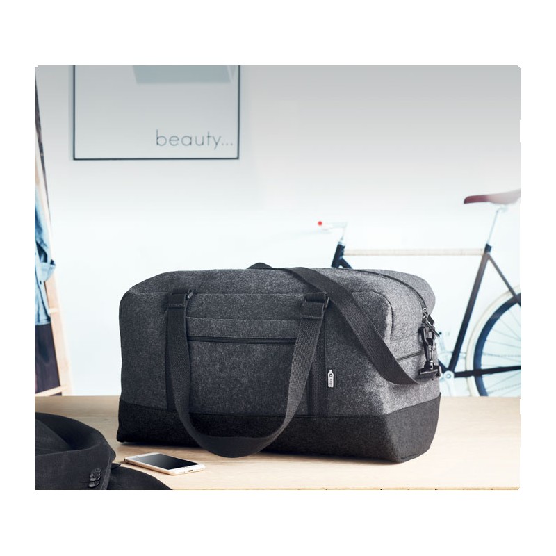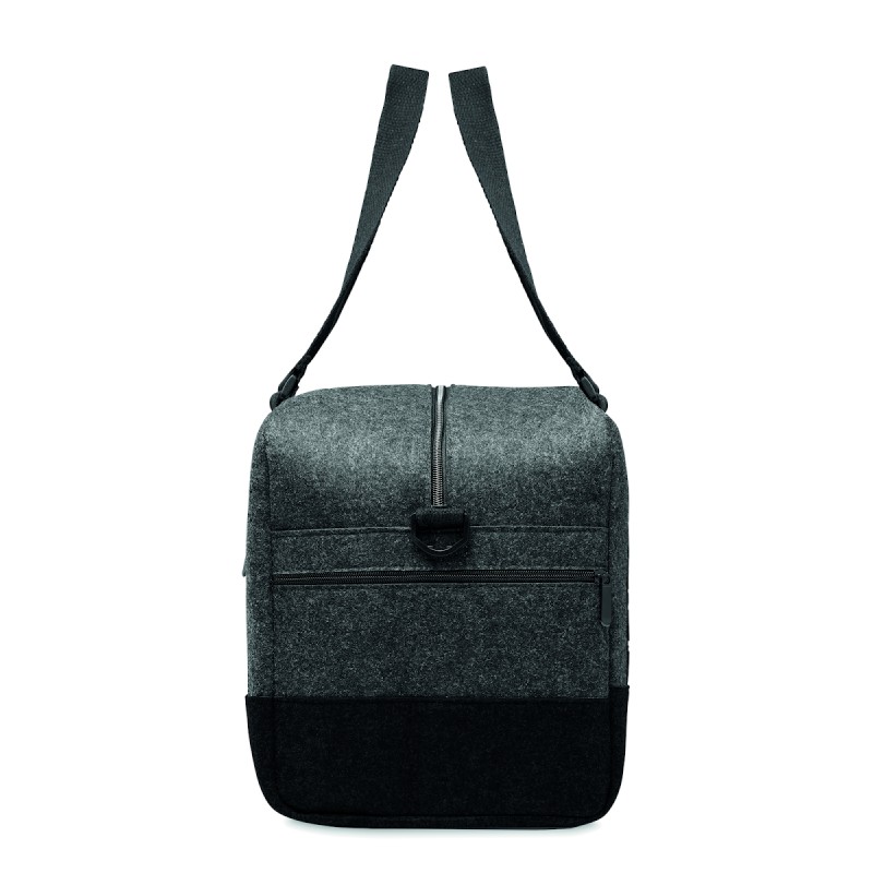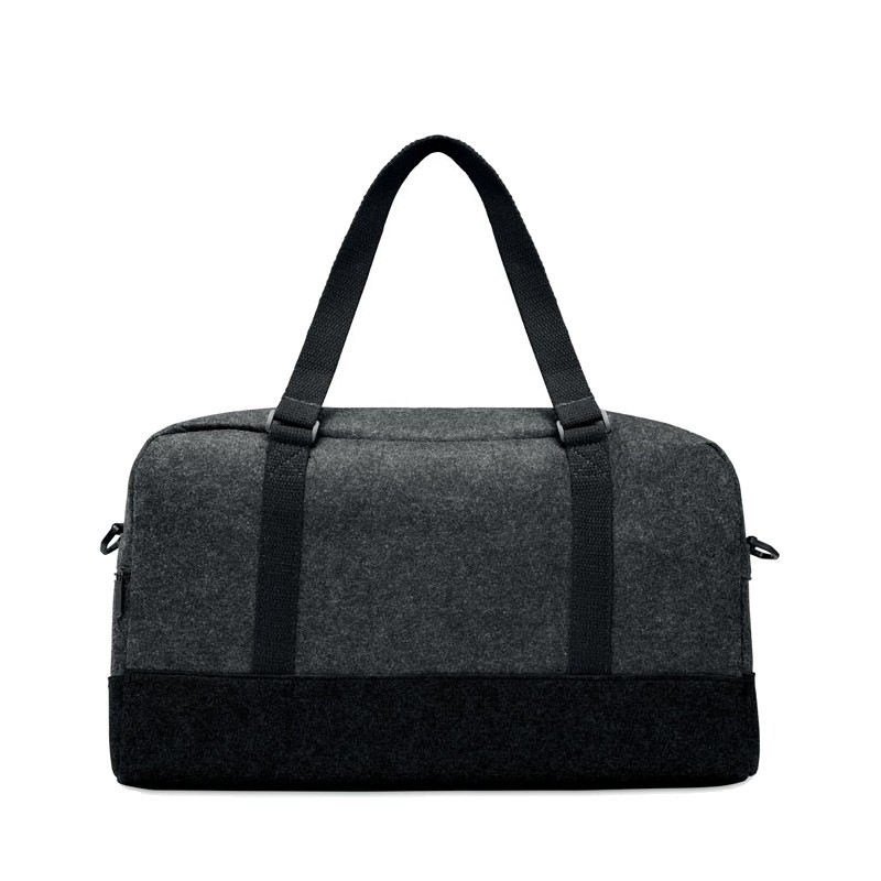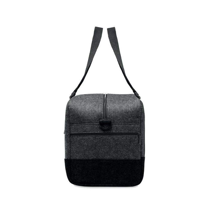 Sac de sport/fitness ou de week-end en feutre RPET avec poche frontale zippée, poignées en toile et bandoulière réglable amovible.