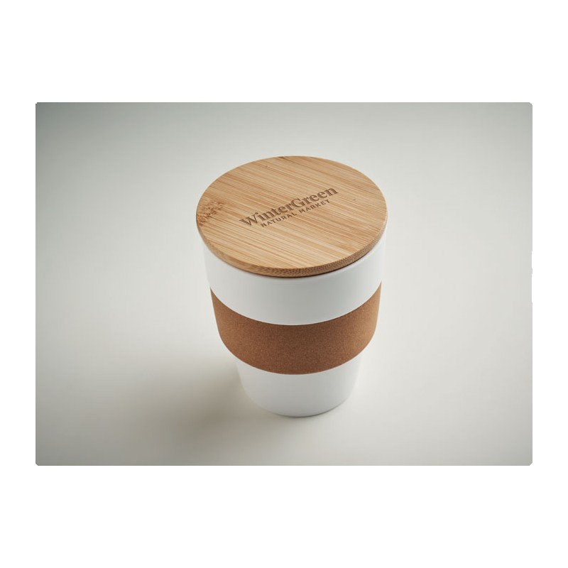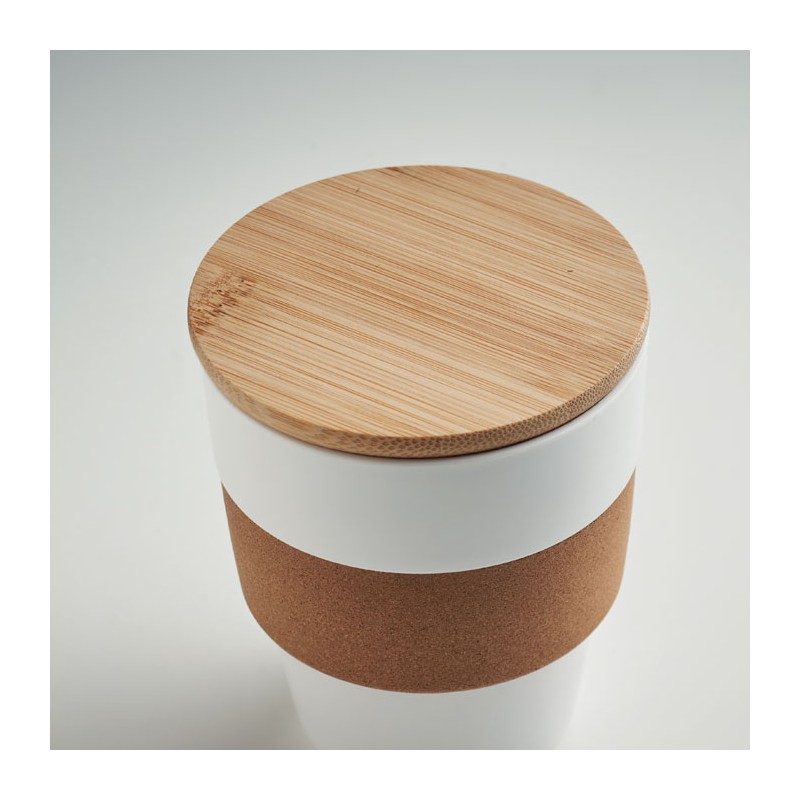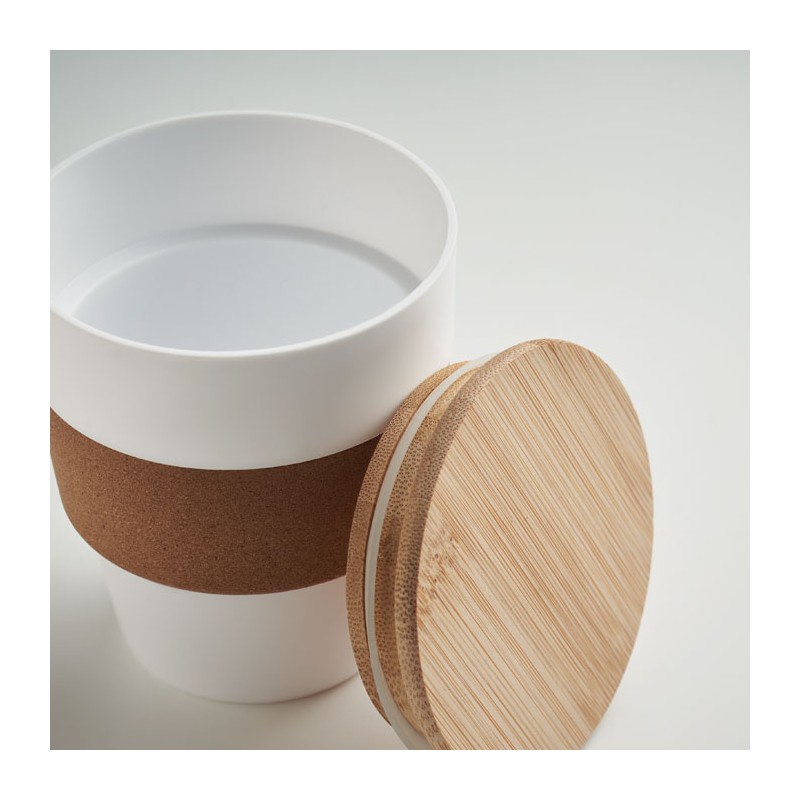 Gobelet simple paroi en PP avec bande de protection en liège et couvercle en bambou. Capacité : 300 ml. S'agissant d'un gobelet à simple paroi, le transfert de chaleur peut se produire. Le bambou est un produit naturel, et présente de légères variations de couleur, de décoration et de tailles.