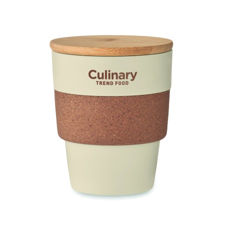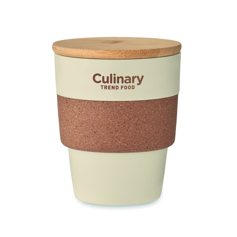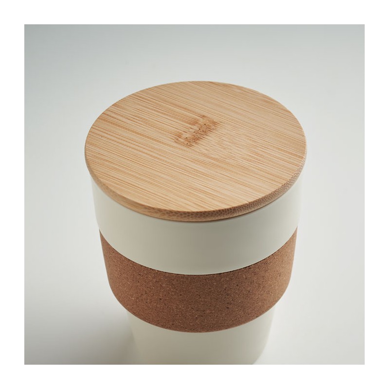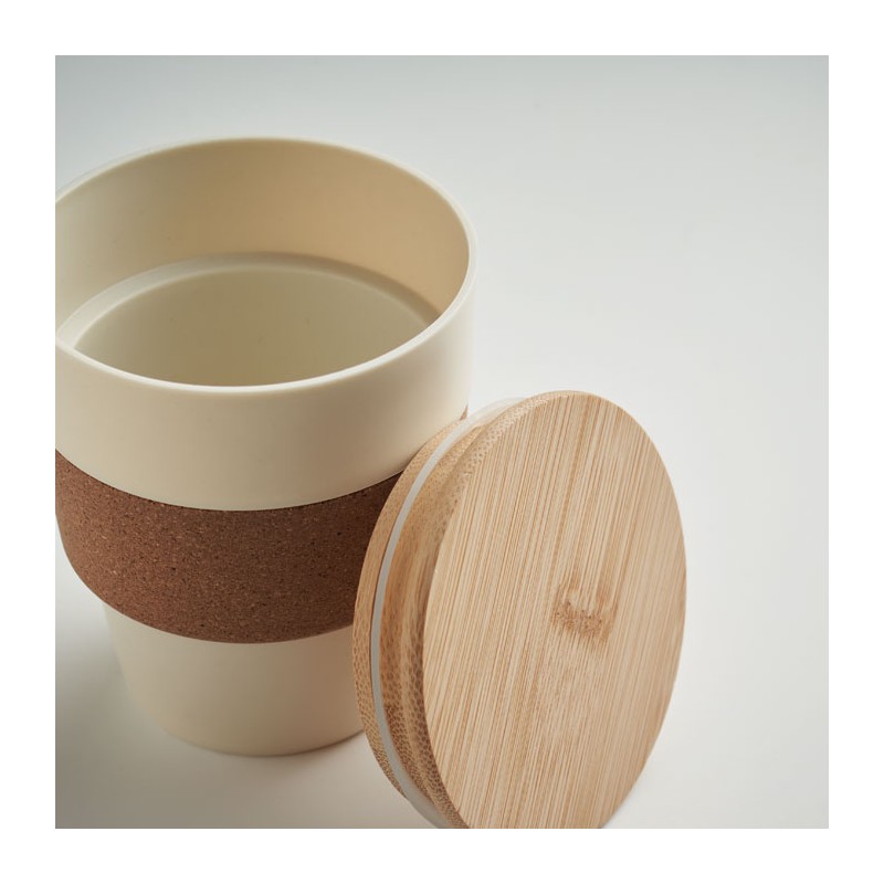 Gobelet simple paroi en PP avec bande de protection en liège et couvercle en bambou. Capacité : 300 ml. S'agissant d'un gobelet à simple paroi, le transfert de chaleur peut se produire. Le bambou est un produit naturel, et présente de légères variations de couleur, de décoration et de tailles.