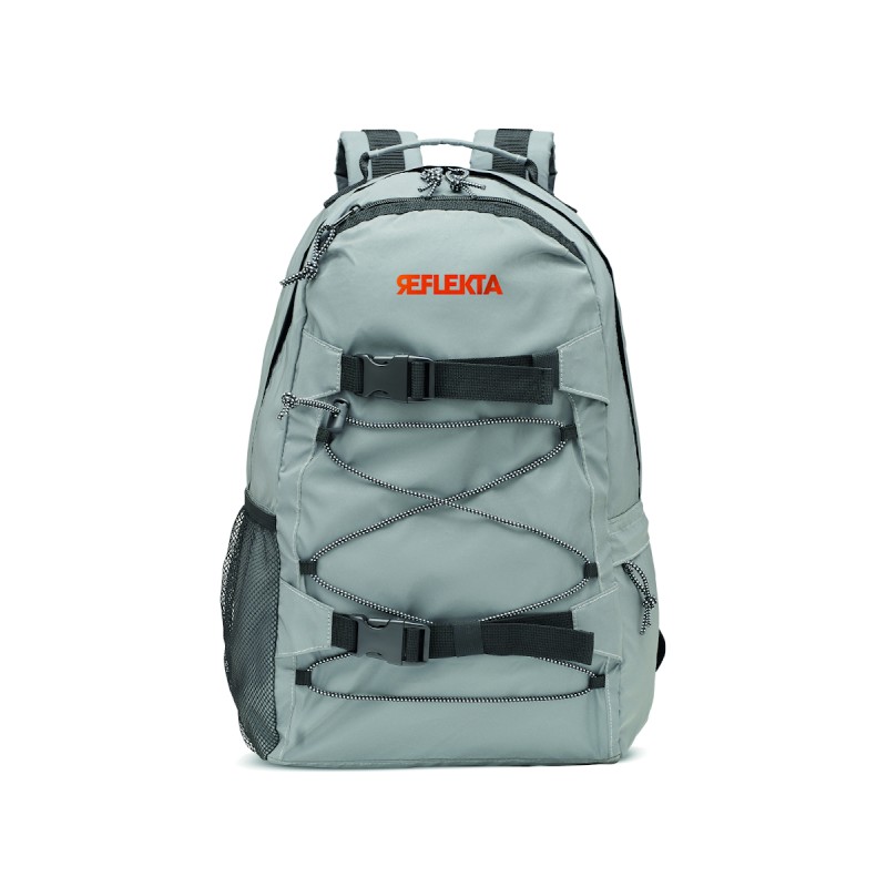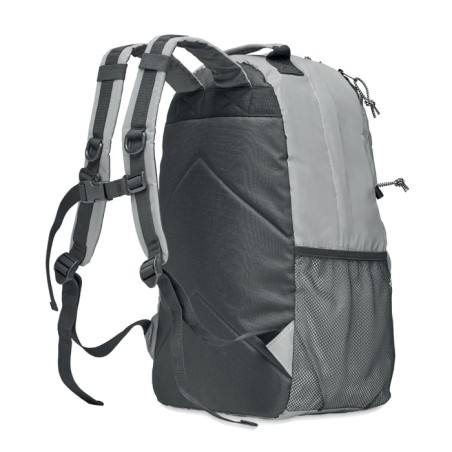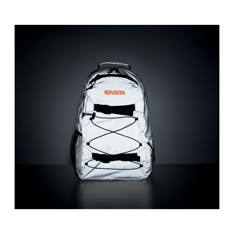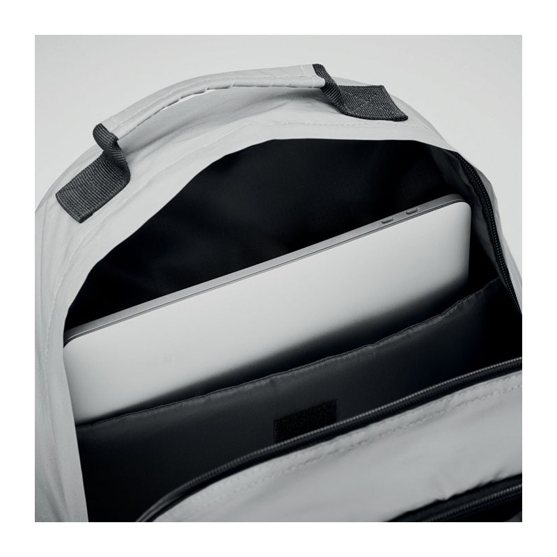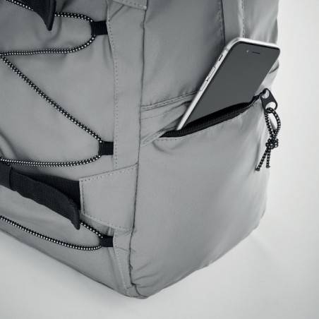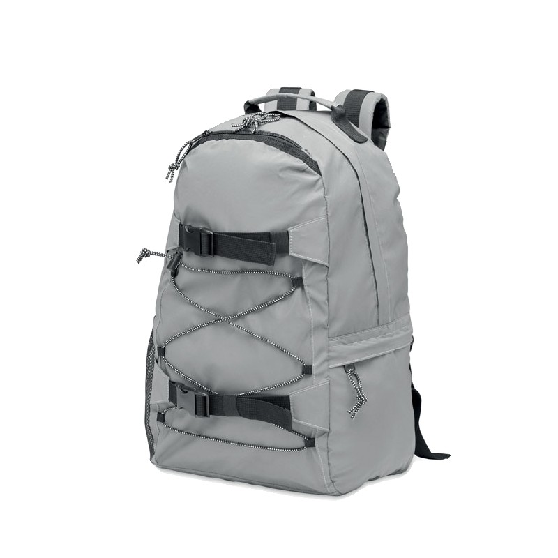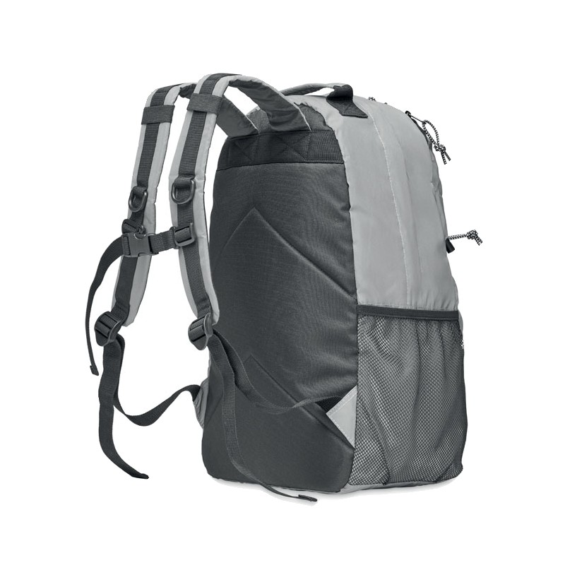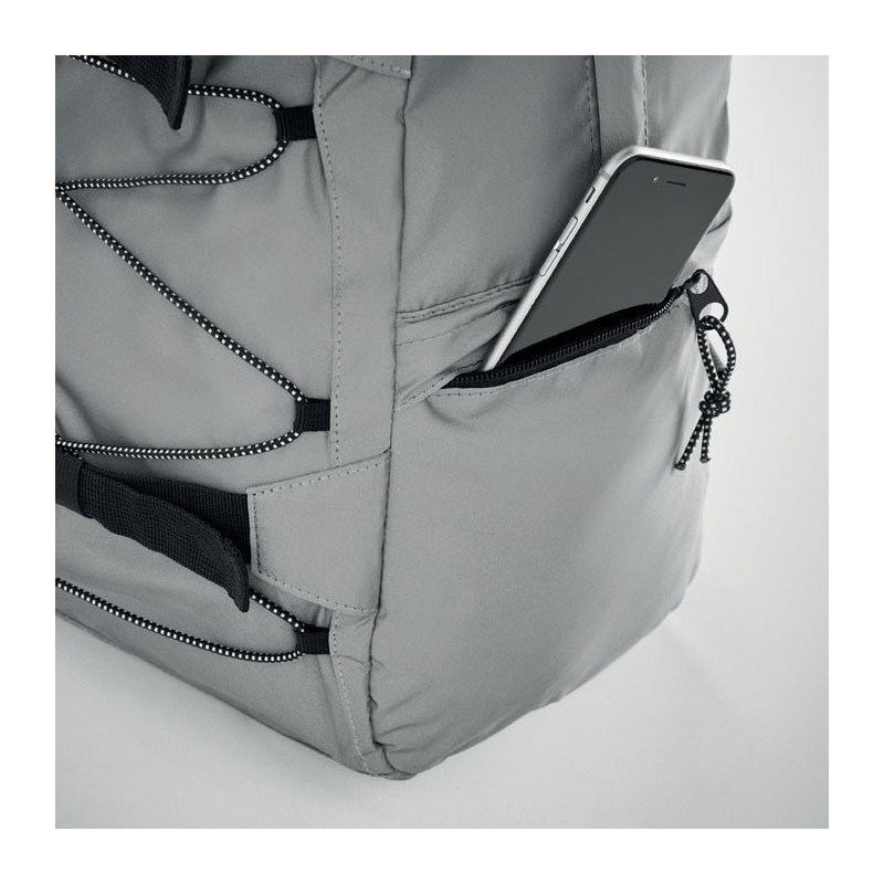 Sac à dos en polyester 190T réfléchissant avec cordon sur le devant. Dos bretelles et fond rembourrés. Compartiment pour ordinateur portable 15''. Une poche latérale en filet et une autre zippée.