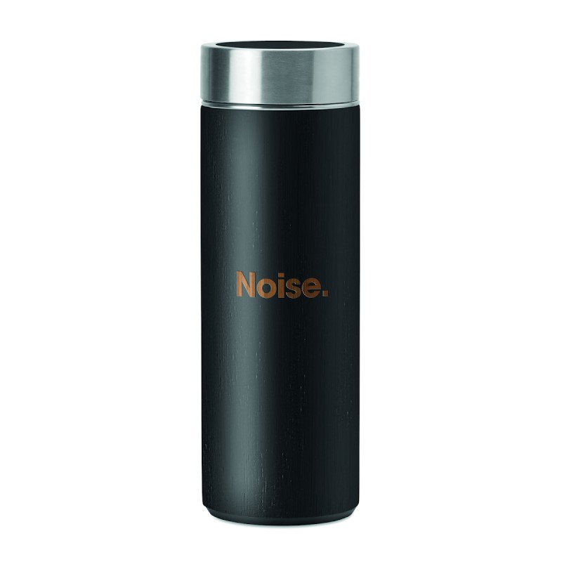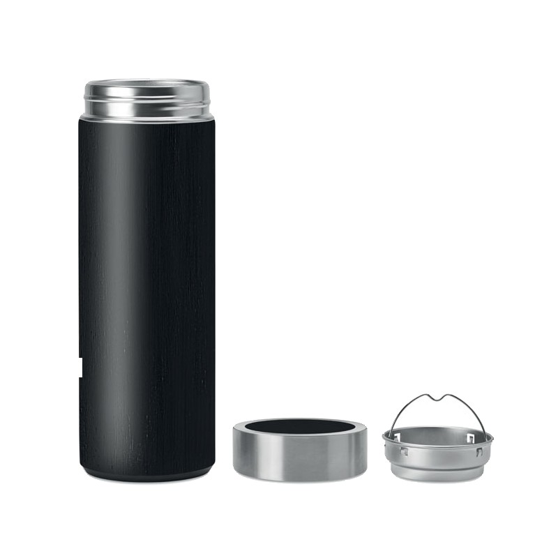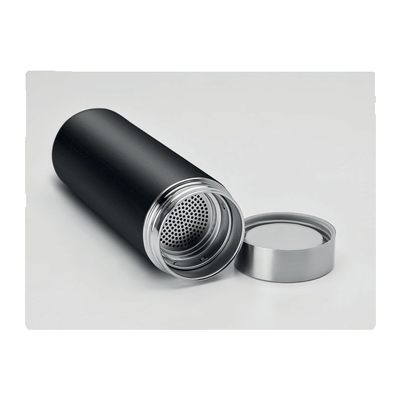 Gourde double paroi Inox avec couvercle isolant en bambou et infuseur à thé. Contenance 400 ml. Le bambou est un produit naturel, et présente de légères variations de couleur, de décoration et de tailles. FSC®-certified | FSC 100%, N5.7, FSC-C213206