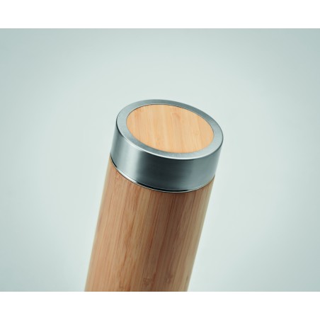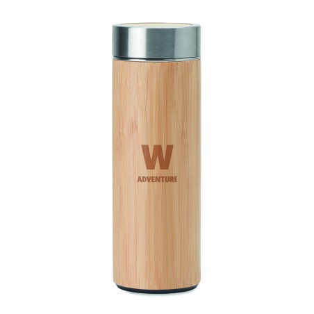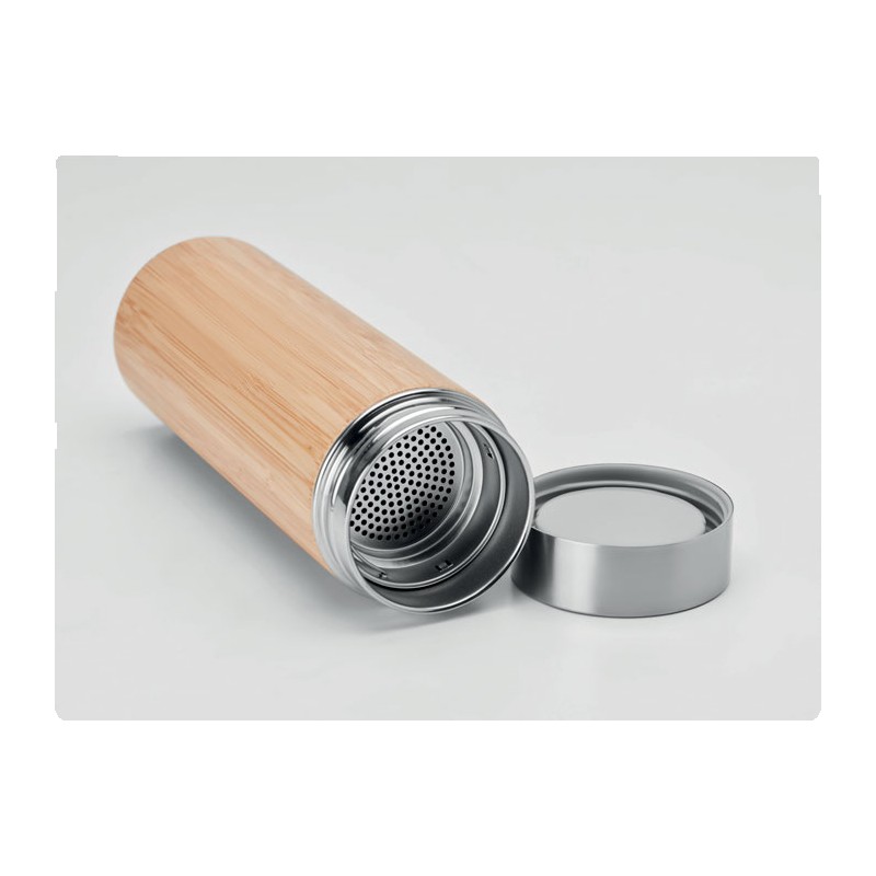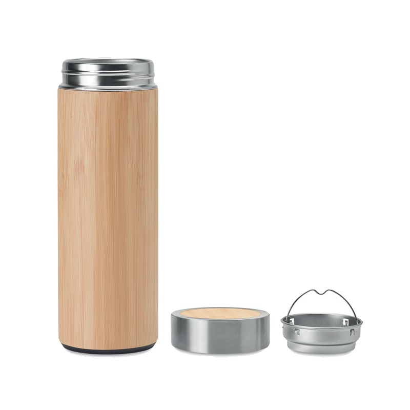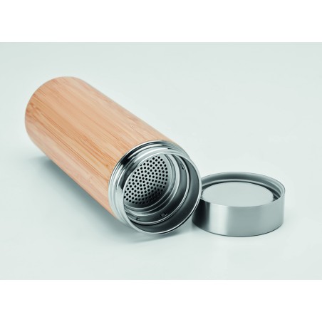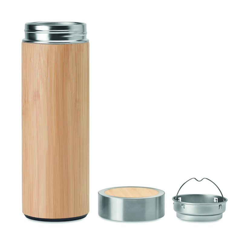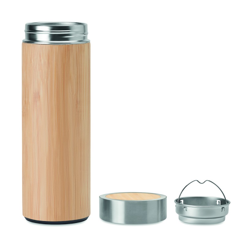 Gourde double paroi Inox avec couvercle isolant en bambou et infuseur à thé. Contenance 400 ml. Le bambou est un produit naturel, et présente de légères variations de couleur, de décoration et de tailles. FSC®-certified | FSC 100%, N5.7, FSC-C213206