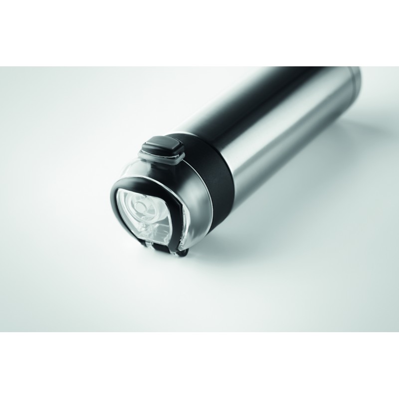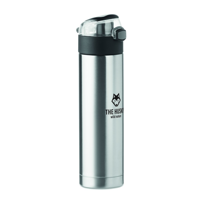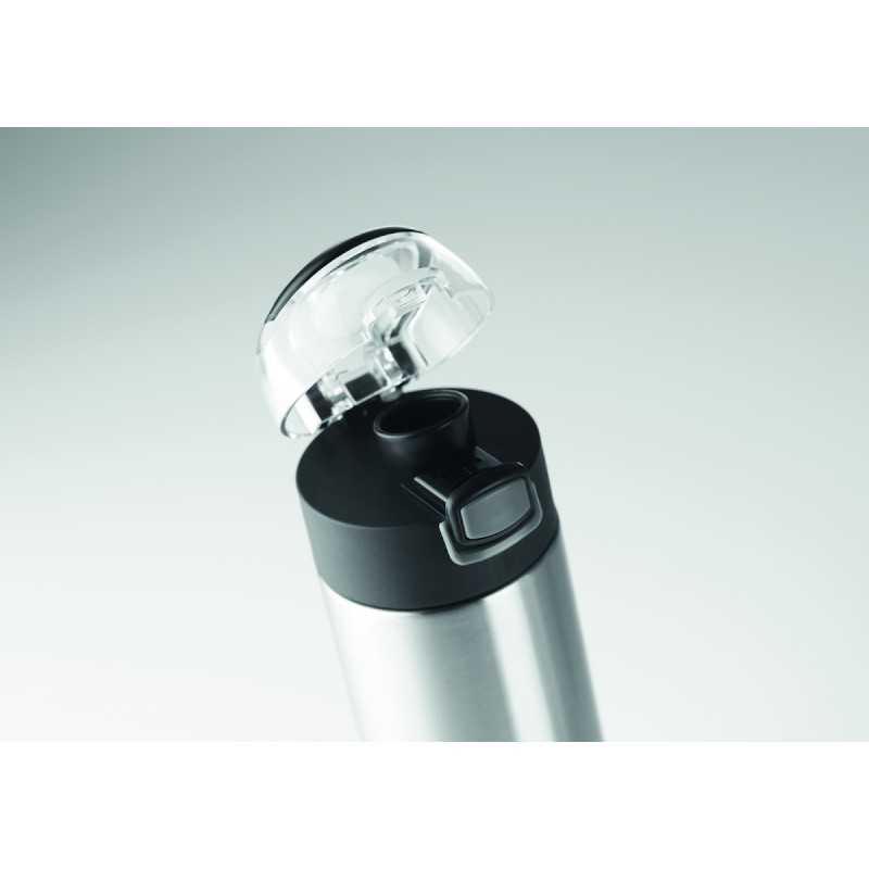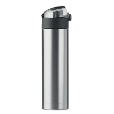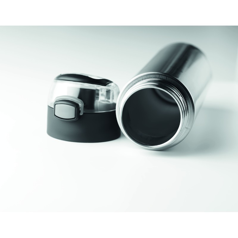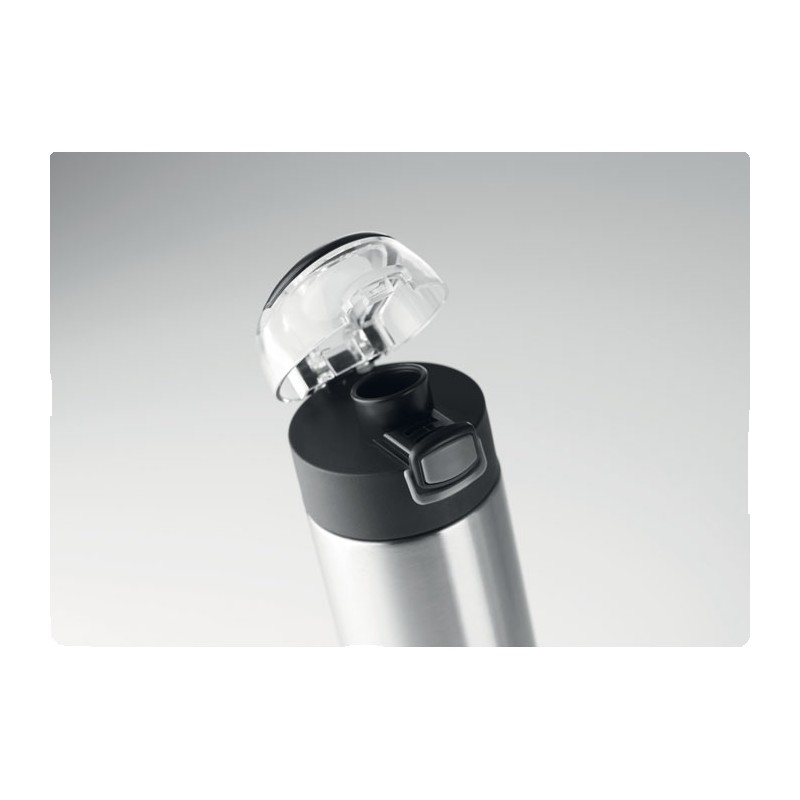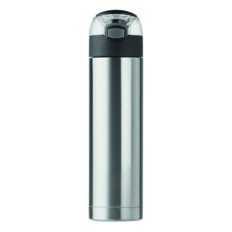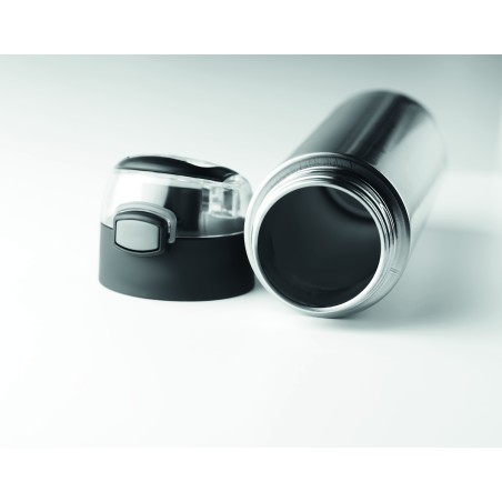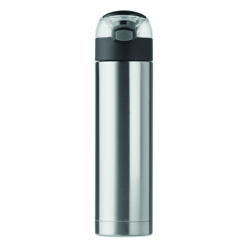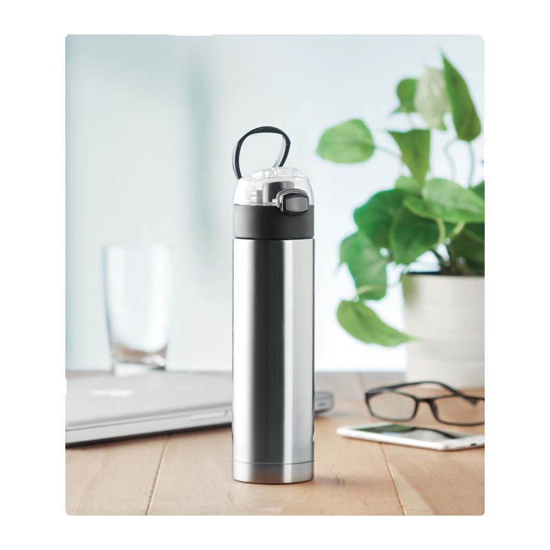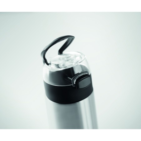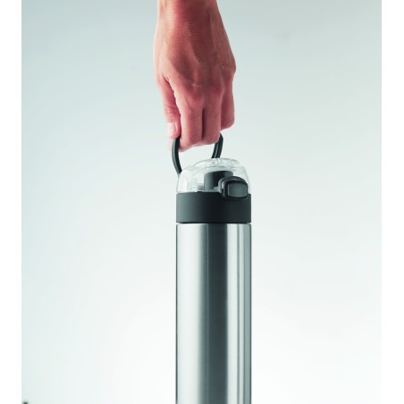 Gourde double paroi en acier inoxydable avec verrou de sécurité sur le couvercle et ouverture par pression. Poignée pliable sur le dessus pour faciliter le transport. Contenance 400 ml. Anti fuite.