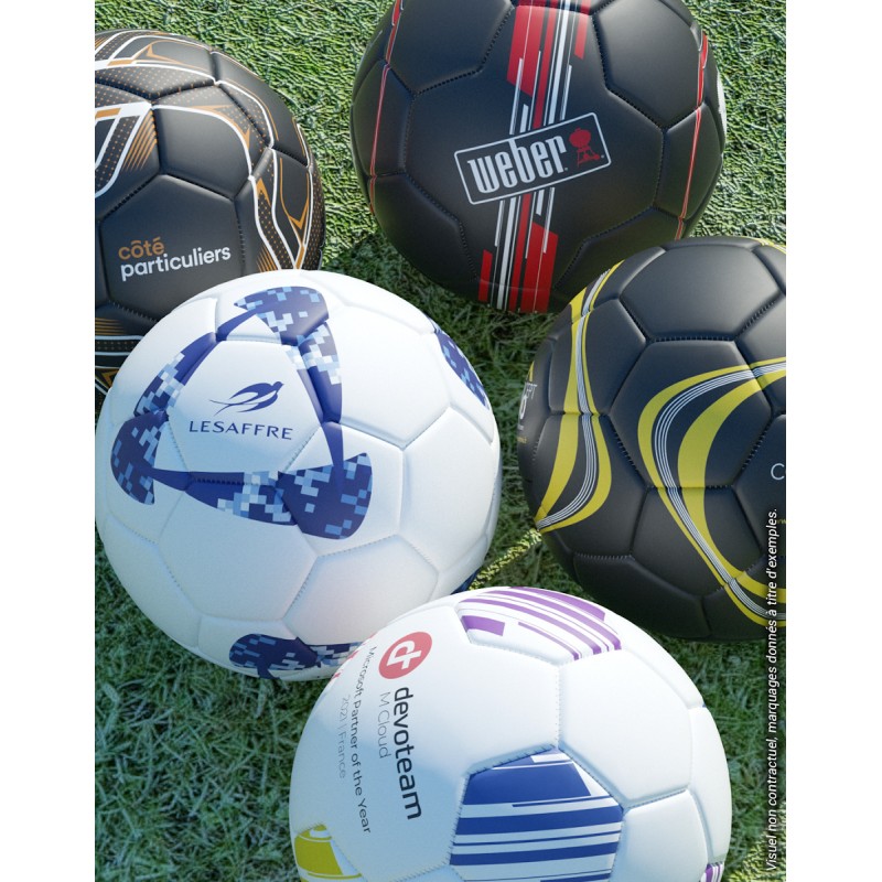 Ballon de football 100% personnalisé. Taille 5 officielle. Diamètre : 21-23cm. Circonférence : 69 à 71cm. Poids officiel : 440g. Ballon cousu machine en 26, 30 ou 32 panneaux. Matière PVC Brillant 2.8mm (finition mat disponible en option). Vessie renforcée en nylon. Personnalisation intégrale en sérigraphie sur tous les panneaux (jusqu’à 6 couleurs maximum). Ballon livré non gonflé sous polybag individuel. Aiguille en option. Minimum de commande : 50 pcs