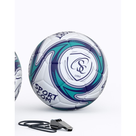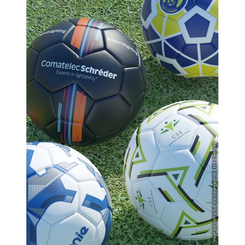 Ballon de football 100% personnalisé idéal pour la promotion et la communication. Taille 5 officielle. Diamètre : 21-23cm. Circonférence : 69 à 71cm. Poids officiel : 440g. Ballon cousu machine en 30 ou 32 panneaux. Matière PVC texturé 3.5mm (finition mat disponible en option). Vessie renforcée en nylon. Personnalisation intégrale en sérigraphie sur tous les panneaux (jusqu’à 6 couleurs maximum). Idéal pour les terrains d’entrainement et la compétition. Ballon livré non gonflé sous polybag individuel. Aiguille en option. Minimum de commande : 100 pcs
