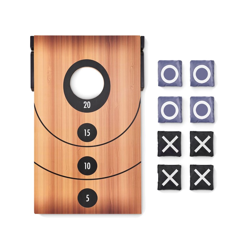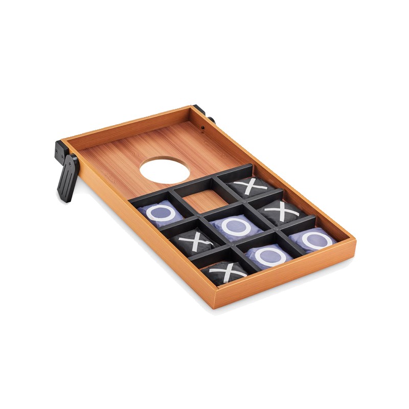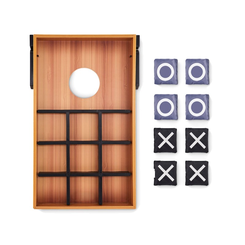 Jeu de lancer de sacs de sable et de morpion double face. Ce jeu, communément appelé Cornhole, trouve son origine en Amérique du Nord. Il se joue principalement à l'extérieur, mais peut être joué à l'intérieur s'il y a suffisamment d'espace. Le plateau est légèrement incliné et percé d'un trou. Le but est de lancer à distance des petits sacs dans ce trou. Chaque fois qu'il y entre, vous marquez des points. La personne qui a le plus de points à la fin ou qui est la première à atteindre un certain nombre de points, gagne. Retournez le plateau pour jouer à un jeu classique de morpion. Comprend un plateau en MDF et 8 sacs à lancer. FSC 100% | W15.2 | FSC-C213206