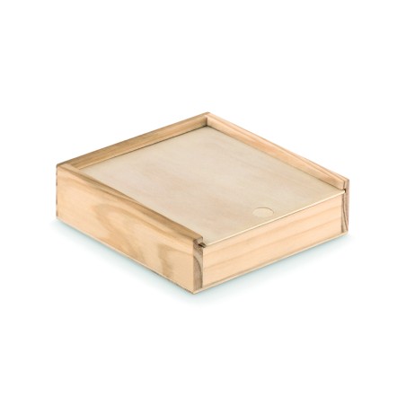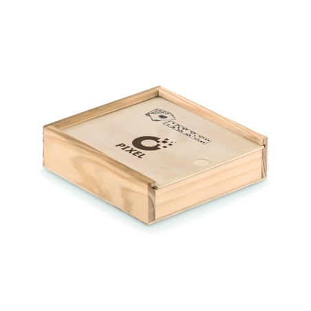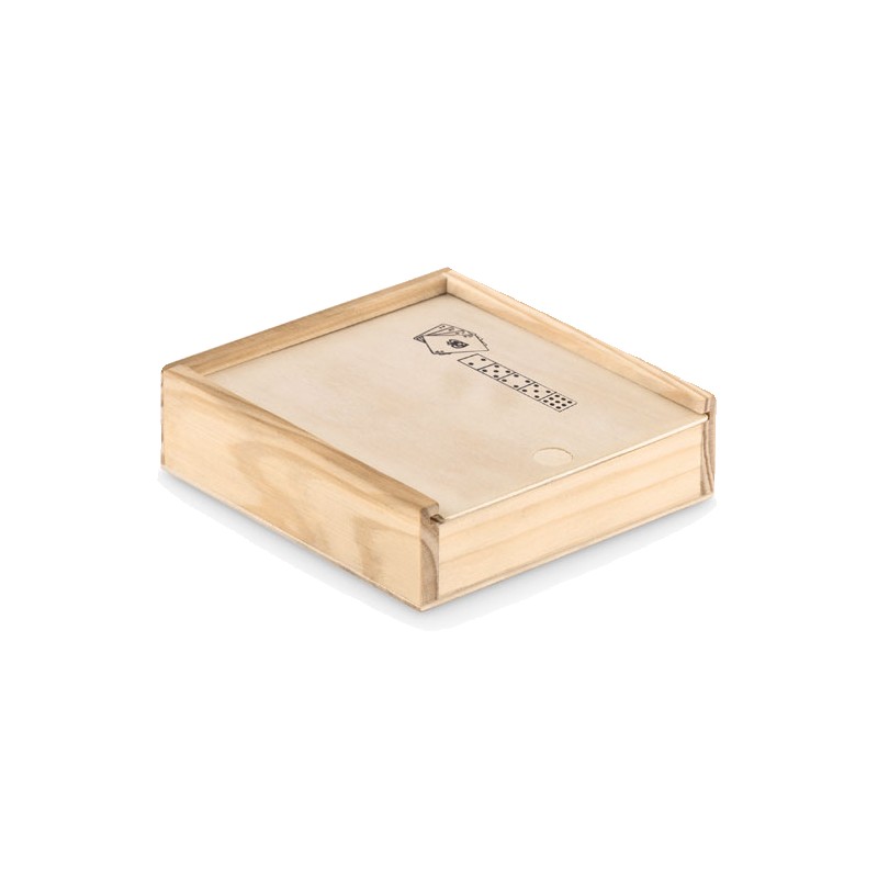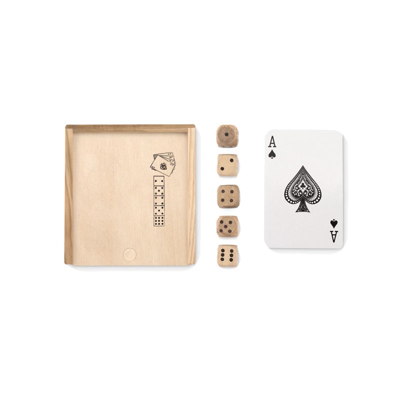 Cartes à jouer et 5 dés présentés dans une boîte en bois.