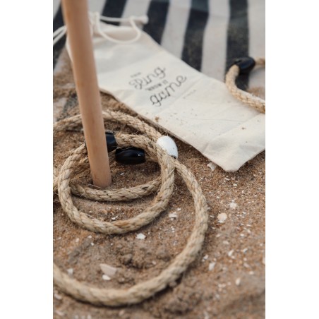 Un jeu de plein air qui fonctionne aussi bien sur la plage qu'au parc, emballé dans un sac en toile avec dos en maille qui le rend facile à transporter. Le jeu consiste à lancer des cordes en forme de cercles sur un bâton que vous fixez simplement au sol. Les différentes tailles des anneaux donnent différentes quantités de points. Un manuel d'instruction complet est inclus.
