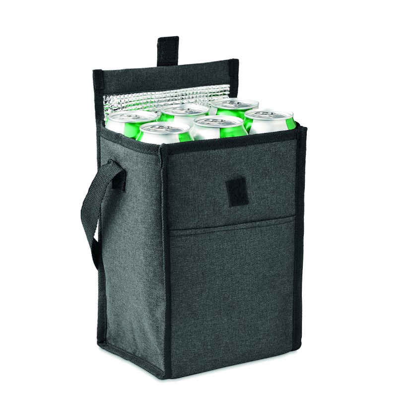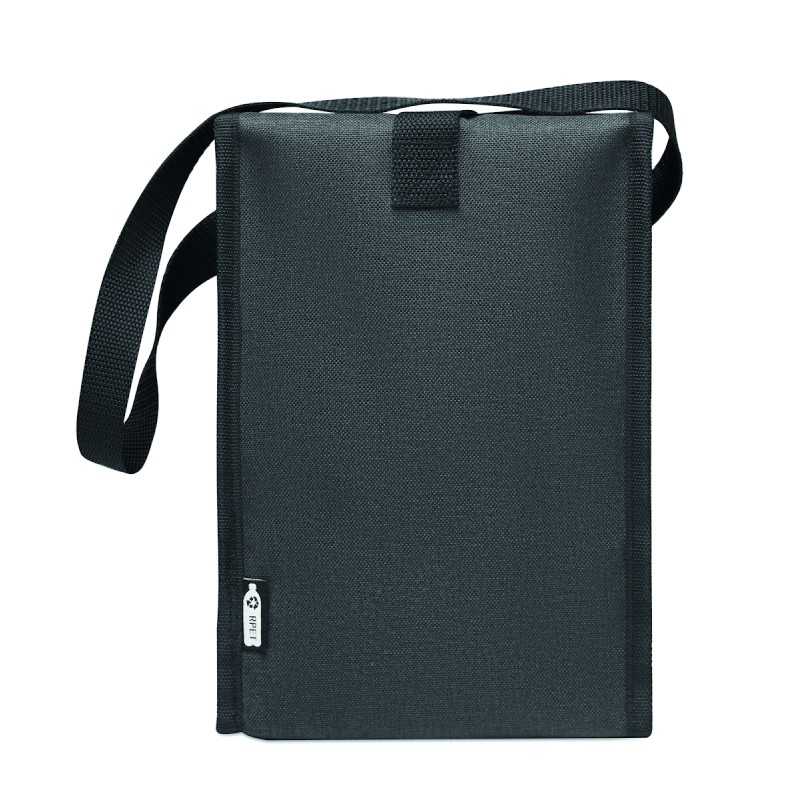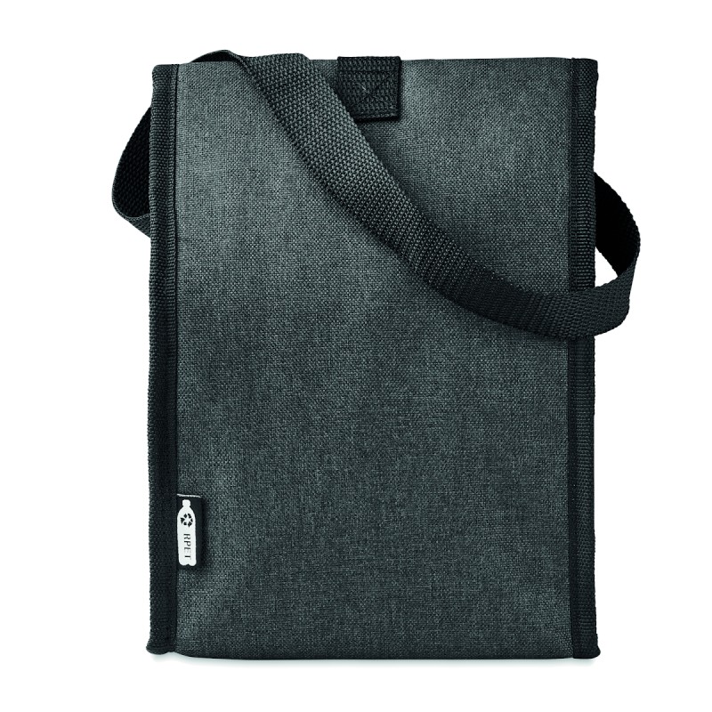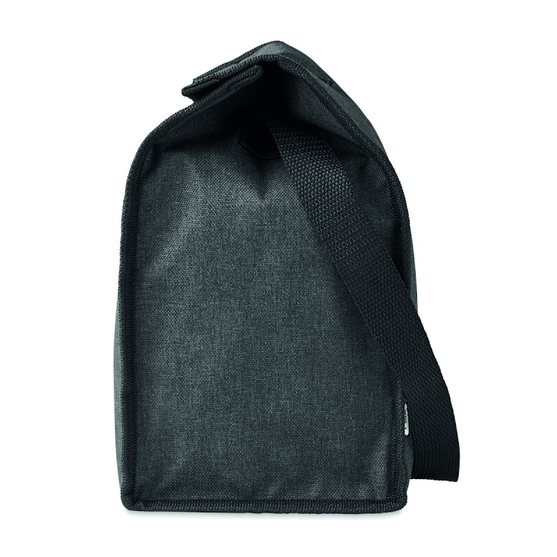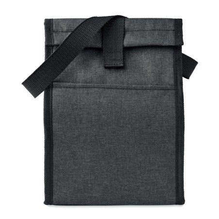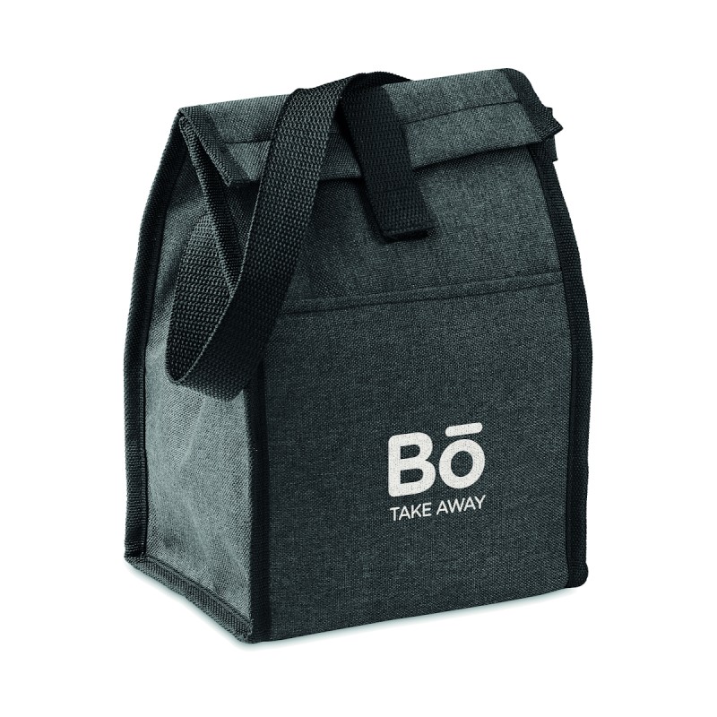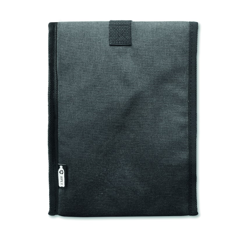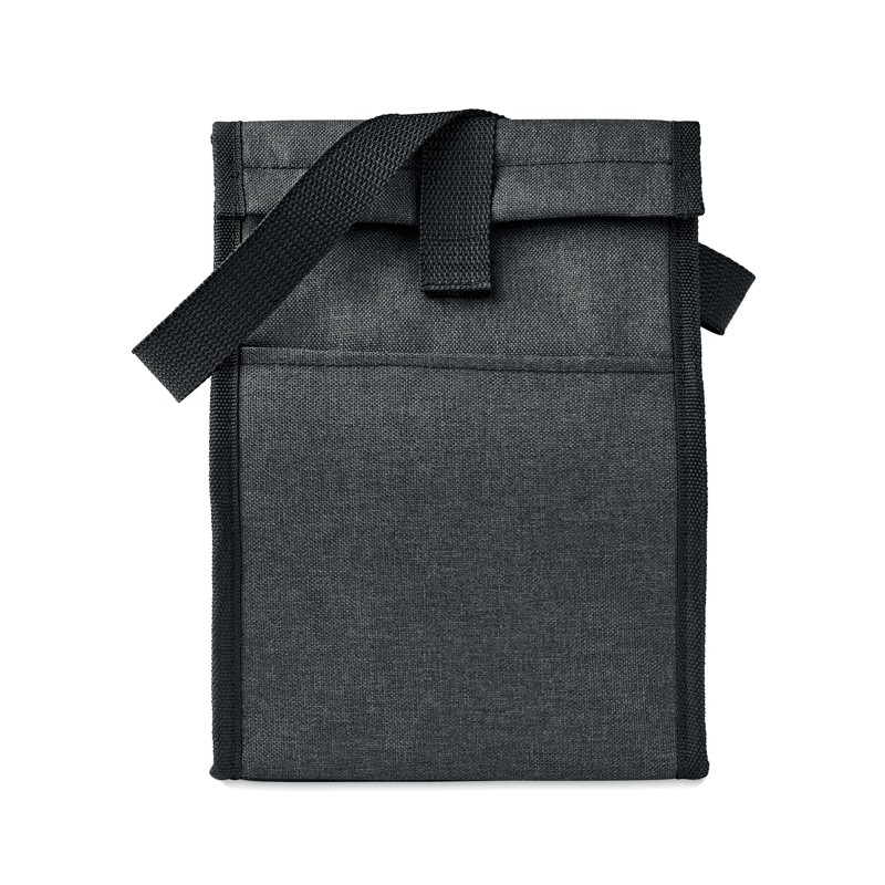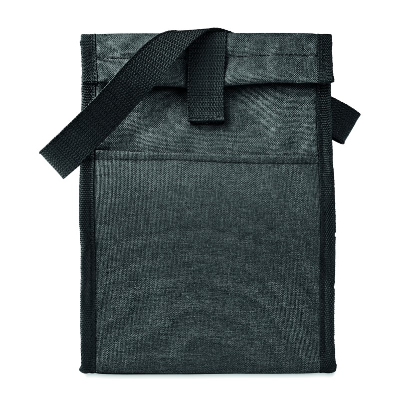 Sac à déjeuner isotherme en RPET 600D avec poche frontale. Capacité 3L. Matériau d'isolation : mousse PE de 2 mm avec feuille d'aluminium.