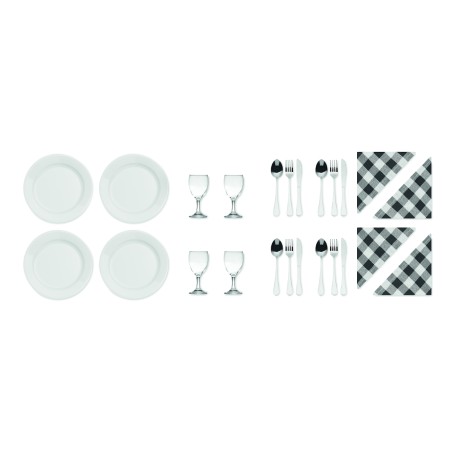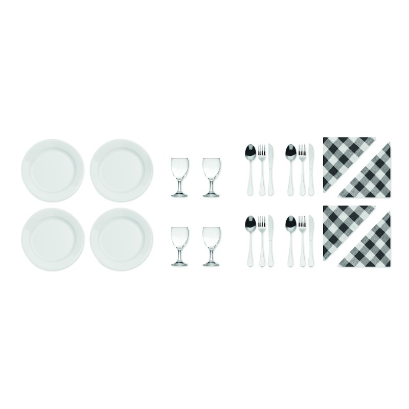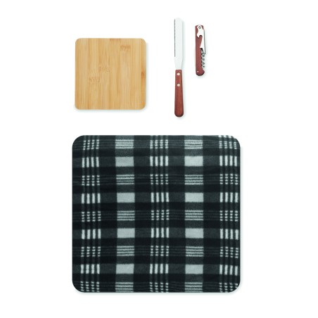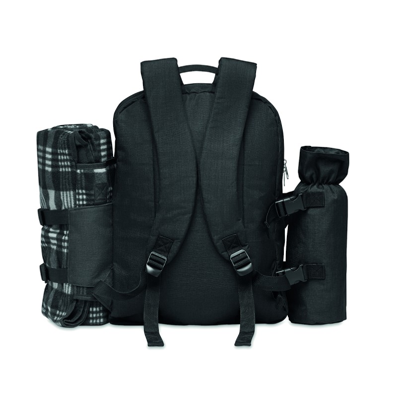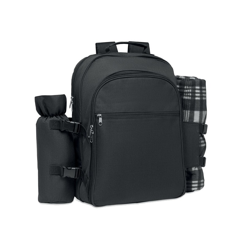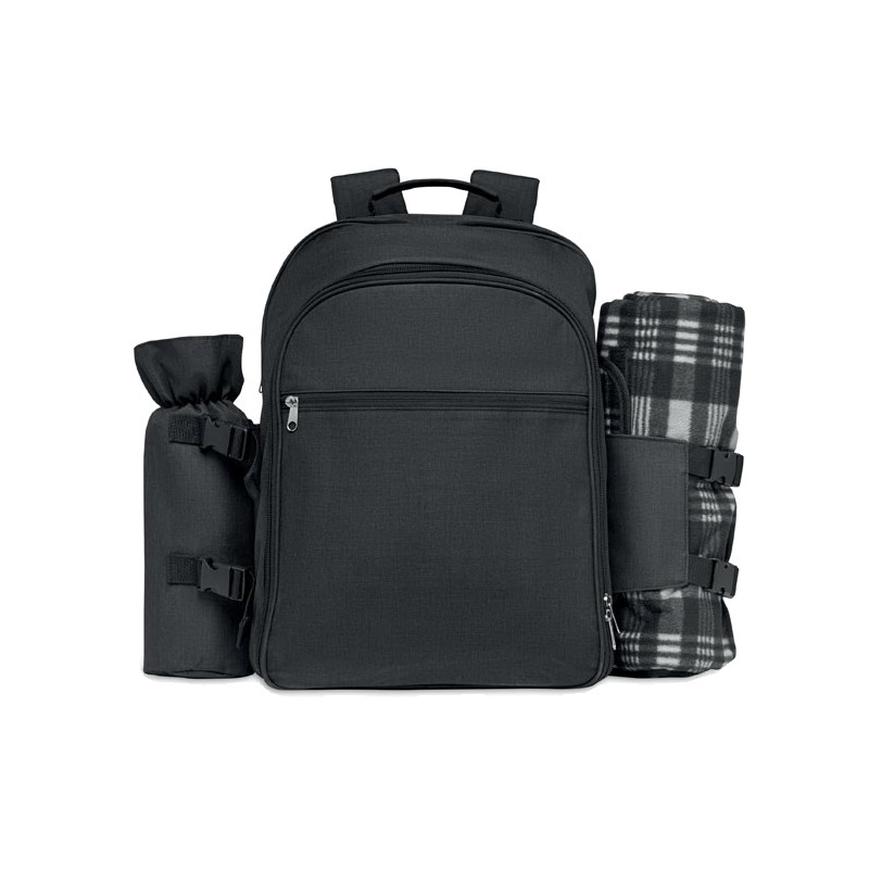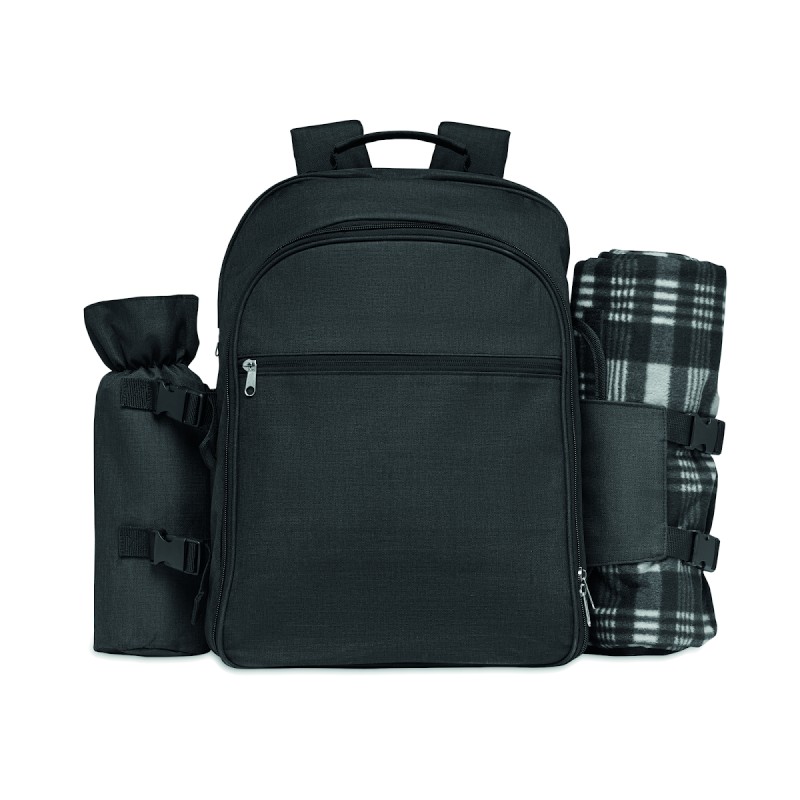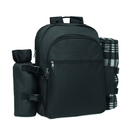 Sac à dos de pique-nique en polyester 300D RPET pour 4 personnes avec compartiment de base réfrigérant, couverts, 1 limonadier, planche à découper, couteau à pain et couverture. Sac en polyester cationique.