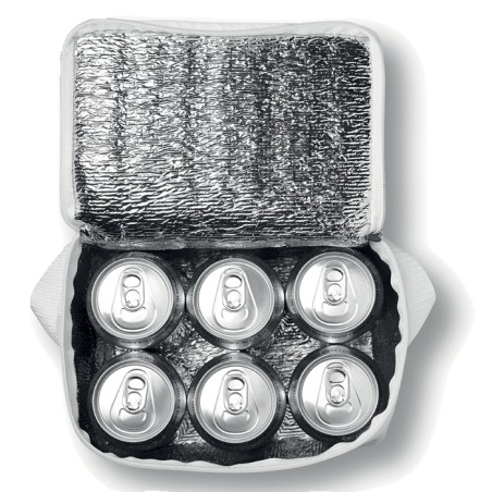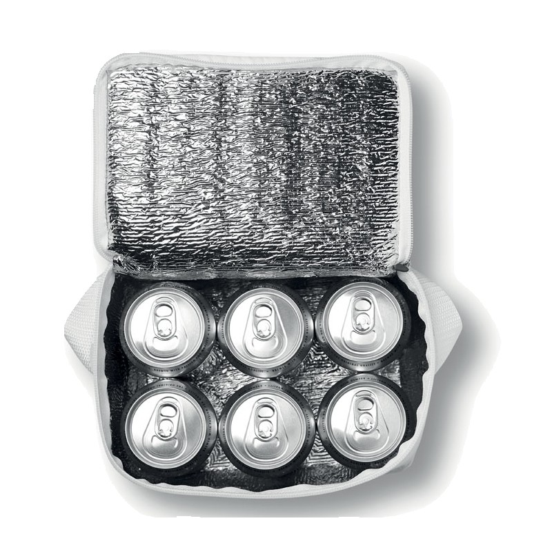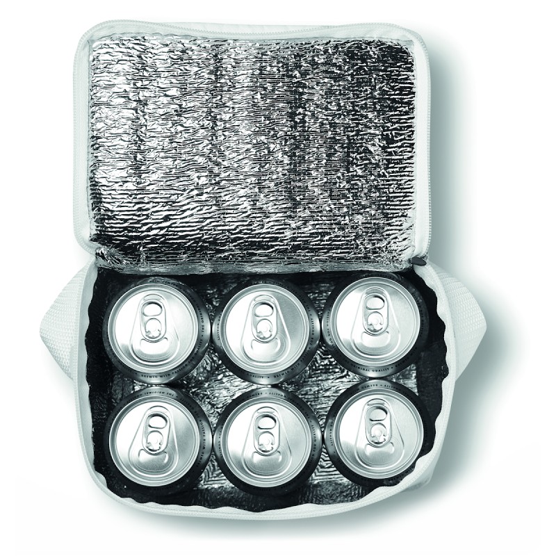 Sac isotherme en polyester 210D, intérieur en feuille d'aluminium. Liseré en non tissé 80gr/m².Prévu pour 6 cannettes. Matériel d'isolation: Mousse laminée avec du papier d'aluminium. Contenance 3L.