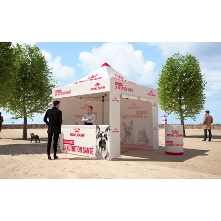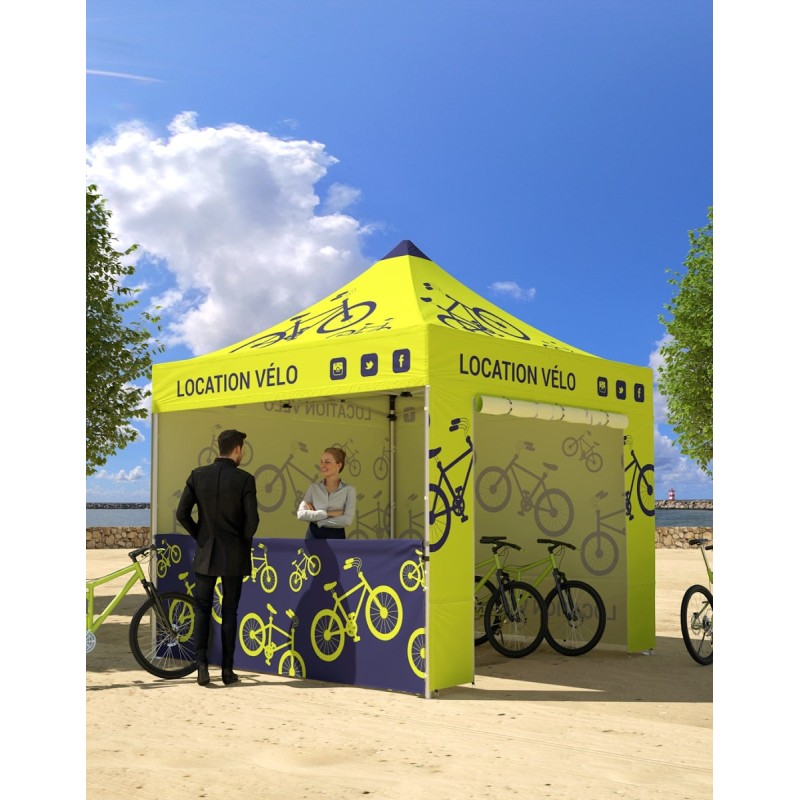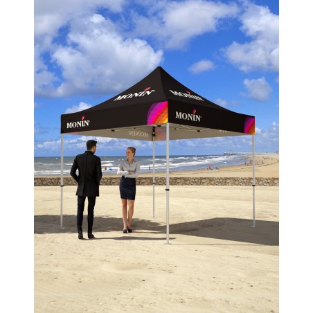 Tente popup 3x3m dépliante en aluminium. Ce barnum est particulièrement robuste. Sa structure est composée d'une armature hexagonale grise en aluminium de diamètre 40mm et d'épaisseur 1,2mm. Elle est personnalisée sur le toit et sur les portes en impression quadri numérique. Le toit et les portes de cette tonnelle sont en polyester Oxford 260g/m² avec enduction pour garantir l'impérméabilité et sont montés par Velcro sur la tente. La tente est livrée prête à monter dans un trolley de transport en Oxford 600D à roulettes. Poids : 14kg