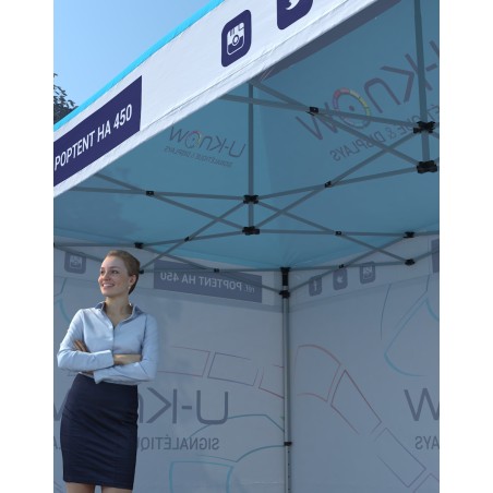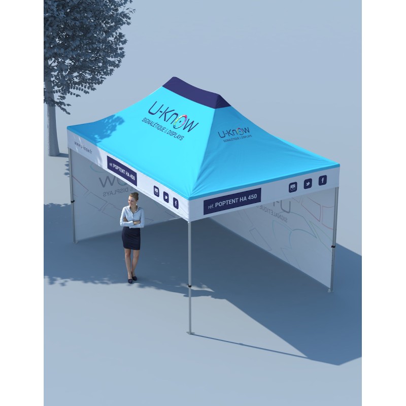 Tente popup 4,5x3m dépliante en aluminium. Ce barnum est particulièrement robuste. Sa structure est composée d'une armature hexagonale grise en aluminium de diamètre 40mm et d'épaisseur 1,2mm. Elle est personnalisée sur le toit et sur les portes en impression quadri numérique. Le toit et les portes sont en polyester Oxford 260g/m² avec enduction pour garantir l'imperméabilité et sont montés par Velcro sur la tente. La tente est livrée prête à monter dans un trolley de transport en Oxford 600D à roulettes. Poids : 19kg
