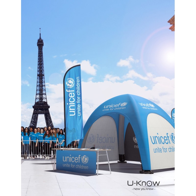 La tente gonflable évenementielle est livrée avec son sac de transport, des sardines et des cordes de fixation ainsi que des poches lestables qui se placent à l’intérieur des pieds noirs pour garder l’esthétique de la tente. Lors de la configuration de votre tente, vous pouvez sélectionnez une structure REGULAR sur stock (disponible uniquement en blanc, livrée en 3 jours) ou une structure ALLOVER avec son toit imprimé en quadri allover (livrée en 4 semaines). Cette nouvelle tente gonflable bénéficie d'une technologie nouvelle : d’un côté, une structure triple peau ultra-légère, de l’autre, un textile avec membrane garantissant l’élasticité, l’étanchéité et la personnalisation totale de la tente (finition ALLOVER). Toutes les coutures sont soudées et étanches. Traitement Anti-feu norme CPAI 84 pour utilisation en intérieur. Le montage est réalisable en 5 minutes. Possibilité de poser des transferts au format A3 sur le toit et/ou sur les portes..Structure disponible sur stock dans notre entrepôt parisien, impression réalisée après validation de la commande