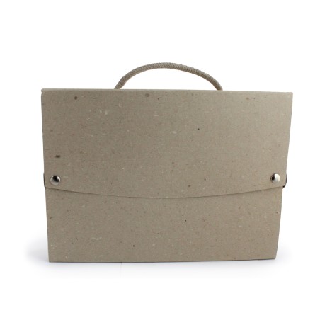 Malette en carton recyclé avec une poignée en cordelette avec des boutons pressions métal. Format : 350x270x40 mm. Les matières premières qui le composent sont issues du recyclage de cartons et papiers collectés en Europe.