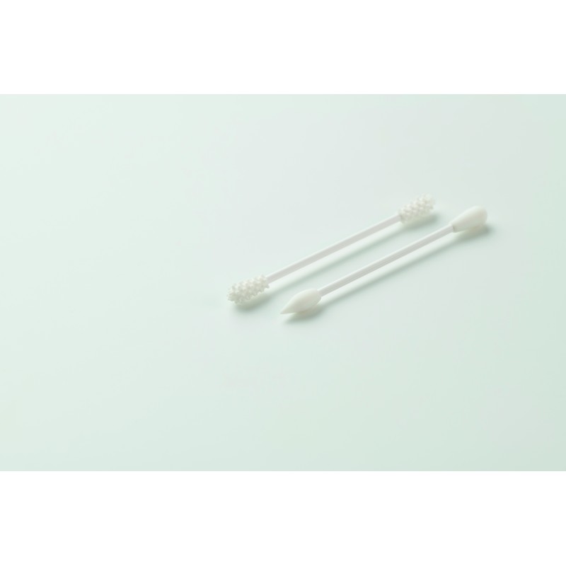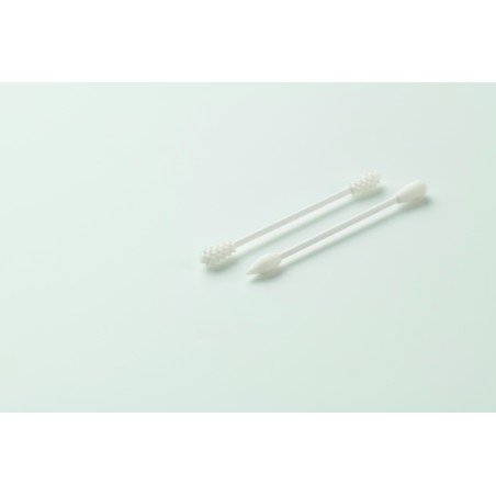 Lot de 2 cotons-tiges en silicone réutilisables et lavables avec 3 têtes différentes. Présentés dans une pochette en coton avec cordon de serrage.