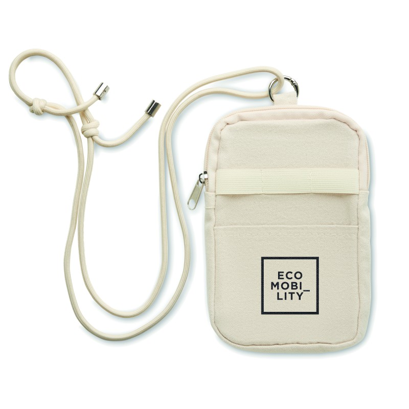 Pochette bandoulière pour smartphone en coton recyclé avec lanière réglable en polyester RPET et poche ouverte sur le devant. 280 gr/m².