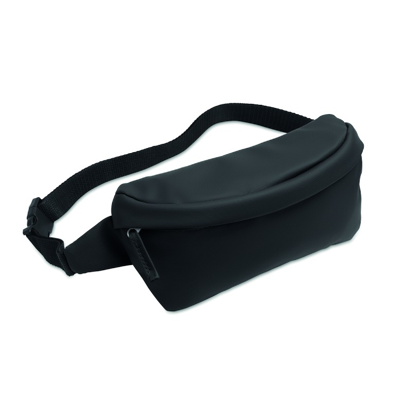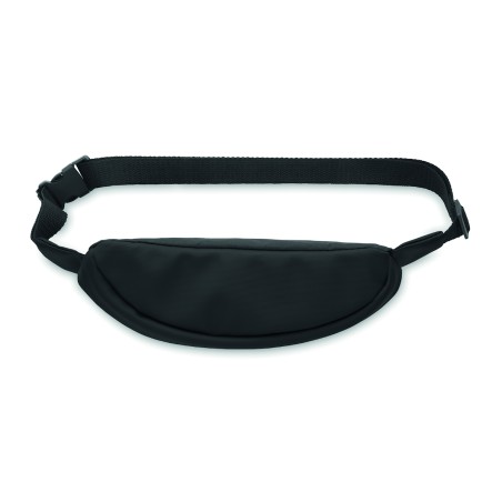Sac banane en polyester 600D RPET et revêtement PU, doublure en polyester 210D RPET et poche frontale zippée.