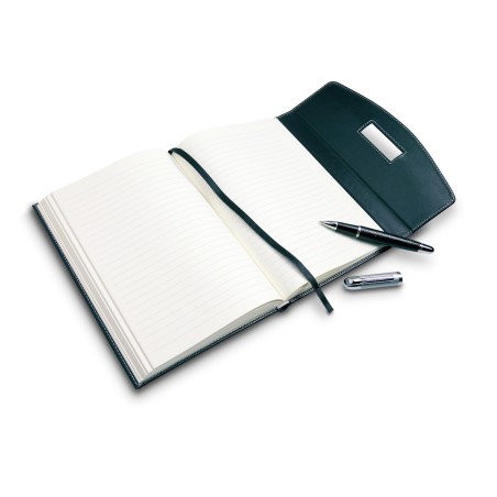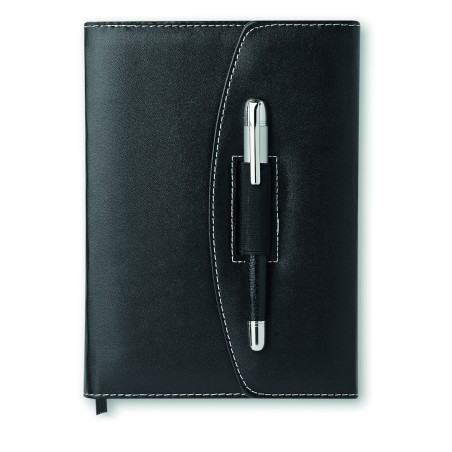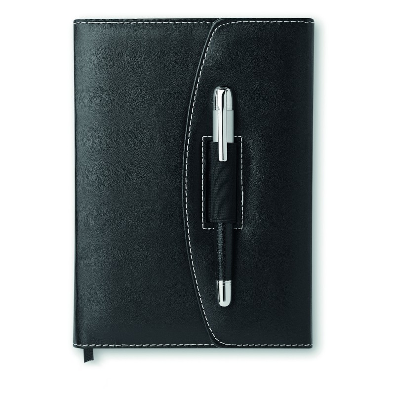 Porte-documents A5 en PU avec surpiqûres contrastées et stylo. 240 pages lignées (120 feuilles). Stylo en métal assorti. Encre noire.