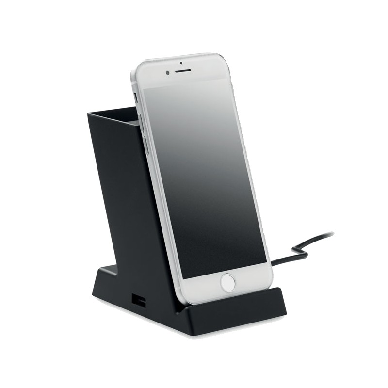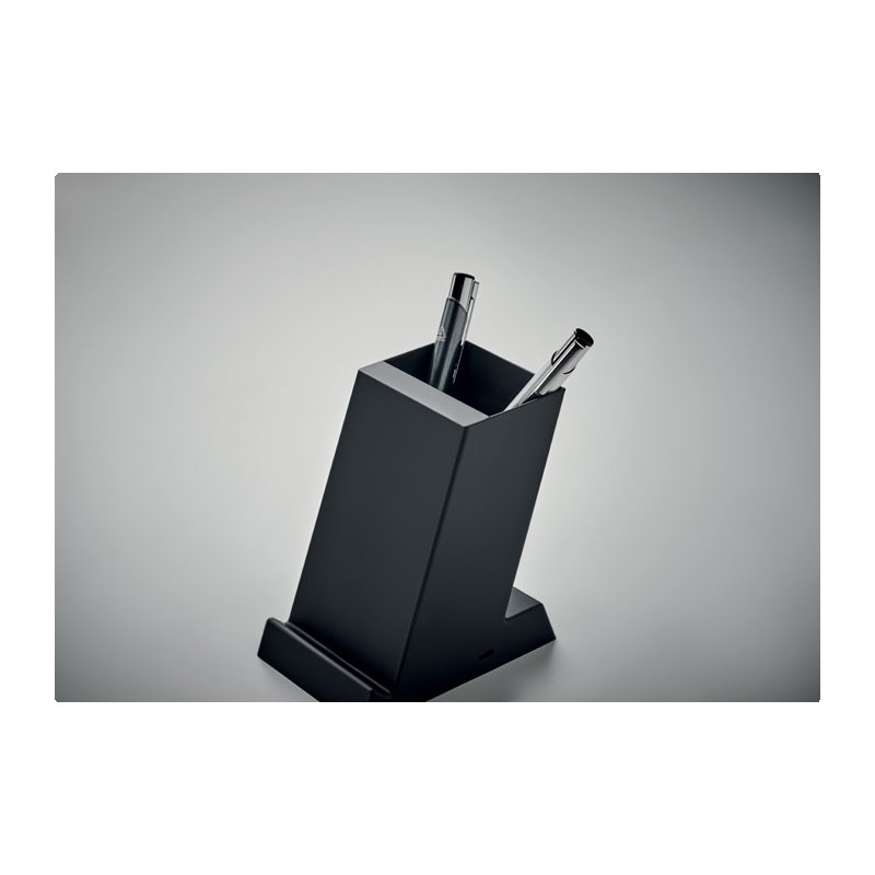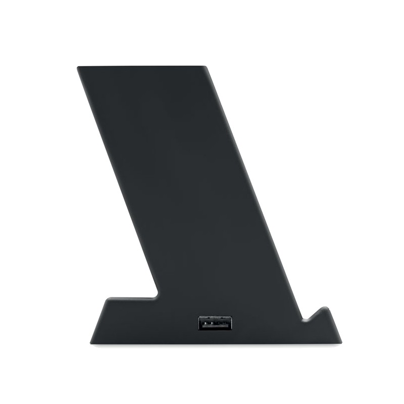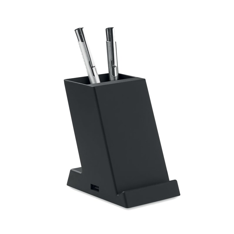 Chargeur sans fil 15W à double bobine avec porte-stylo en ABS. Sortie : 9V/1.67A (15W) pour une charge rapide. 1 sortie d'alimentation sur port USB-A.