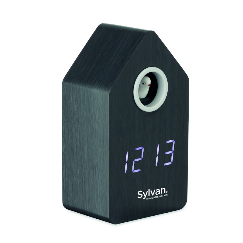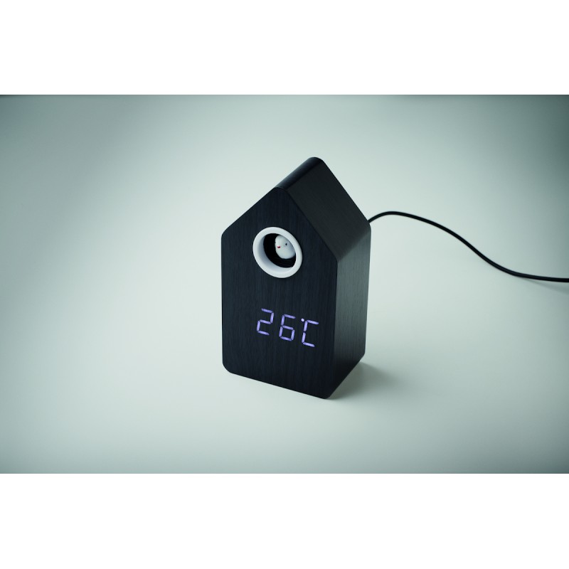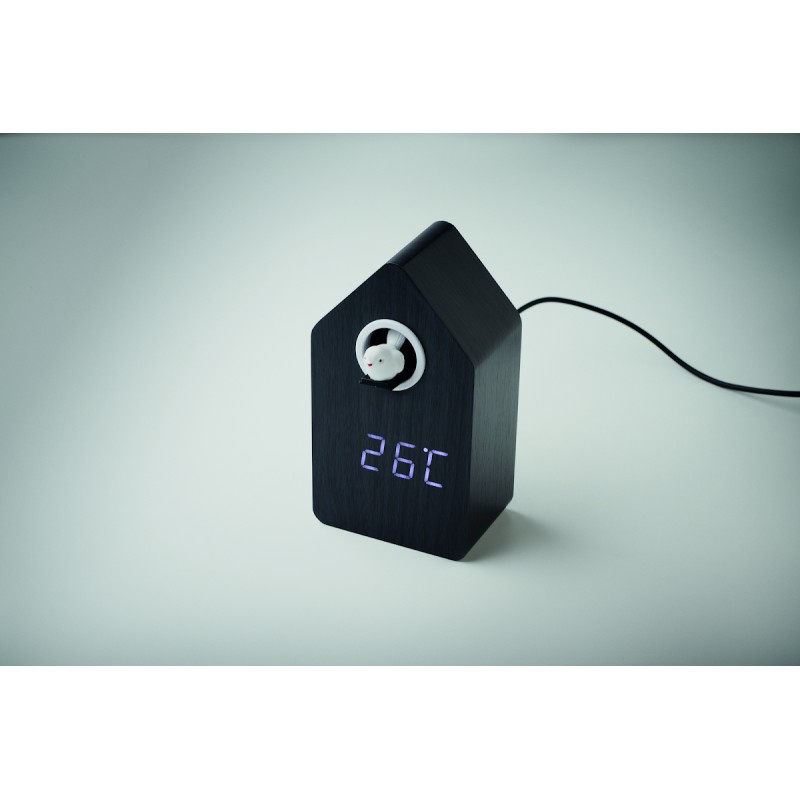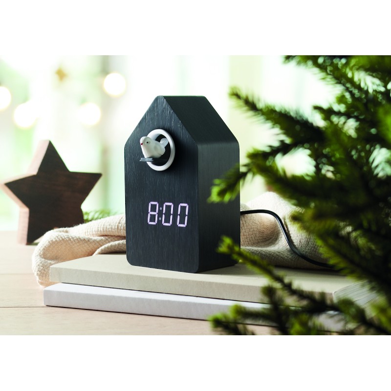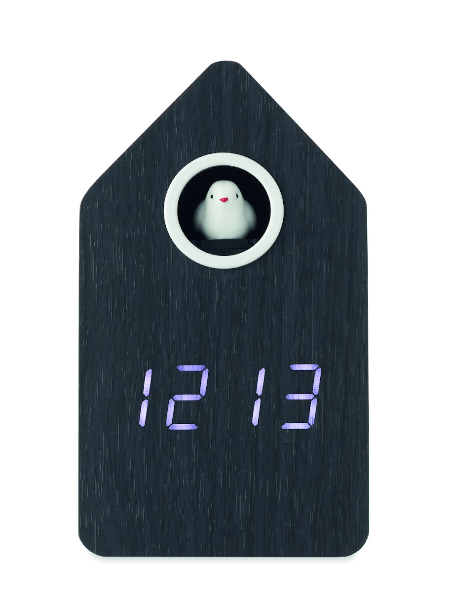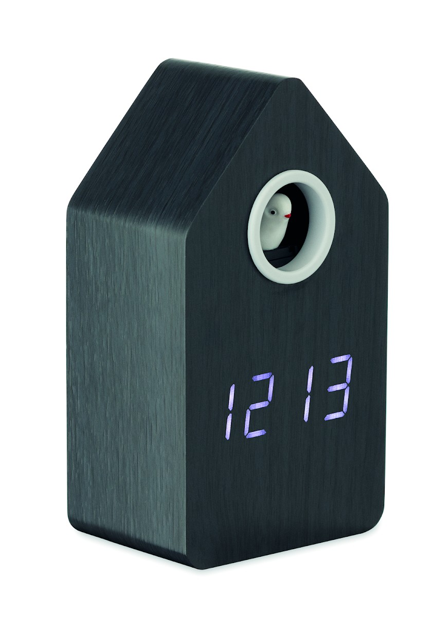 Coucou en MDF avec alarme intégrée et affichage de la température. L'oiseau sortira et chantera à chaque nouvelle heure et à l'horaire de l'alarme. Affichage LED blanc. Mode silence entre 22h00 et 06h00. intervalles de répétition de 5 minutes.