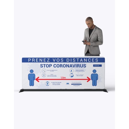 Cette barrière personnalisable d'intérieur offre une très bonne stabilité grâce à ses pieds bien ouverts. Son avantage principal réside dans la possibilité d’habiller la structure en impression numérique sur le recto seul ou ou sur le recto/verso (2 visuels différents possibles). La housse recouvre la structure en aluminium. L’ensemble s’installe en 2 minutes et se range facilement dans le sac de transport fourni. Son poids léger en fait une structure facilement transportable. Utilisation intérieure exclusivement.Notice de montage incluse dans le sac de transport..Structure disponible sur stock dans notre entrepôt parisien, impression réalisée après validation de la commande