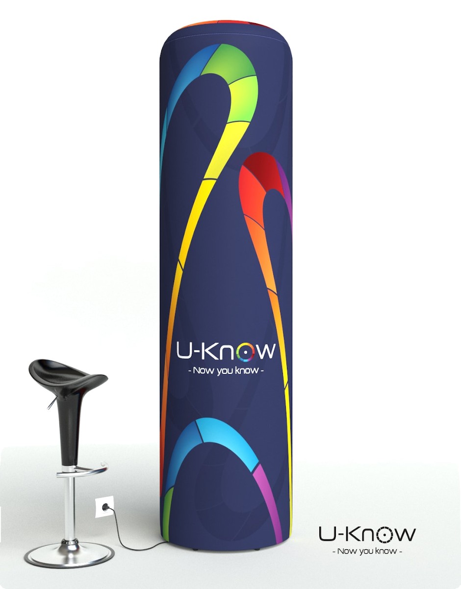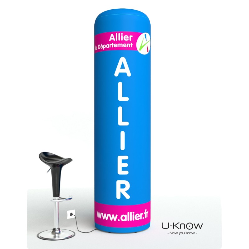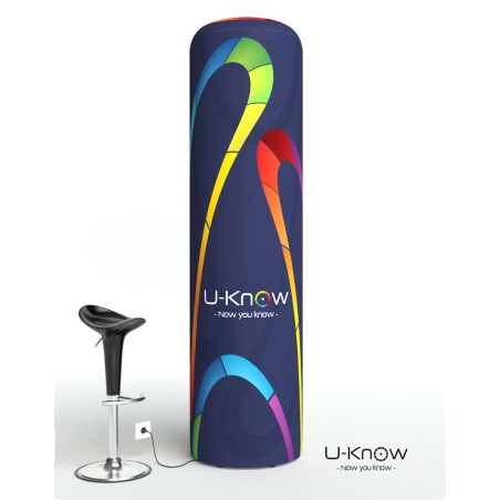 Nouvelle colonne / gonflable avec gonfleur intégré de hauteur 220cm et de diamètre 60cm. Une pompe de gonflage et de dégonflage de 150 Watts est intégrée au plateau bas de la structure. La colonne est livrée entièrement montée : vous n’avez qu’à appuyer sur le bouton pour gonfler votre produit. Un branchement électrique est nécessaire pour le montage de la colonne. Une fois la colonne gonflée, le câble se range à l’intérieur de la structure et il n’est plus nécessaire d’avoir une source de courant. Le visuel est imprimé en sublimation sur une toile polyester en allover et est monté à son extrémité avec un joint en silicone pour fixer la toile au plateau inférieur. Utilisation intérieure exclusivement..Structure disponible sur stock dans notre entrepôt parisien, impression réalisée après validation de la commande
