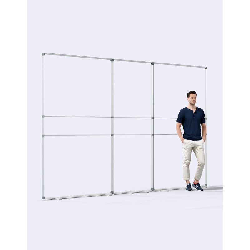 Stand composé d'un cadre aluminium autoportant de 400x230cm. 2 pieds. Déploiement très facile. Le cadre supérieur vient s'emboiter sur le cadre inférieur. Une réhausse de 30cm est fournie afin de porter la structure à 2,30m de haut. Le module peut se relier à d'autre grâce aux embouts de fixation livré avec. L’habillage est réalisé sur une toile en polyester recyclé de 210 g traité antifeu norme européenne B1. L’impression est faite dans l’Oise (Made In France) des deux côtés en sublimation numérique haute définition pour une visibilité recto-verso. L’extrémité des toiles est cousue avec un jonc en silicone afin de glisser le visuel dans la rainure du cadre en aluminium. Le tout est livré dans un sac de transport, la légèreté et l’agilité de ces structures en font des supports installables et renouvelables facilement.