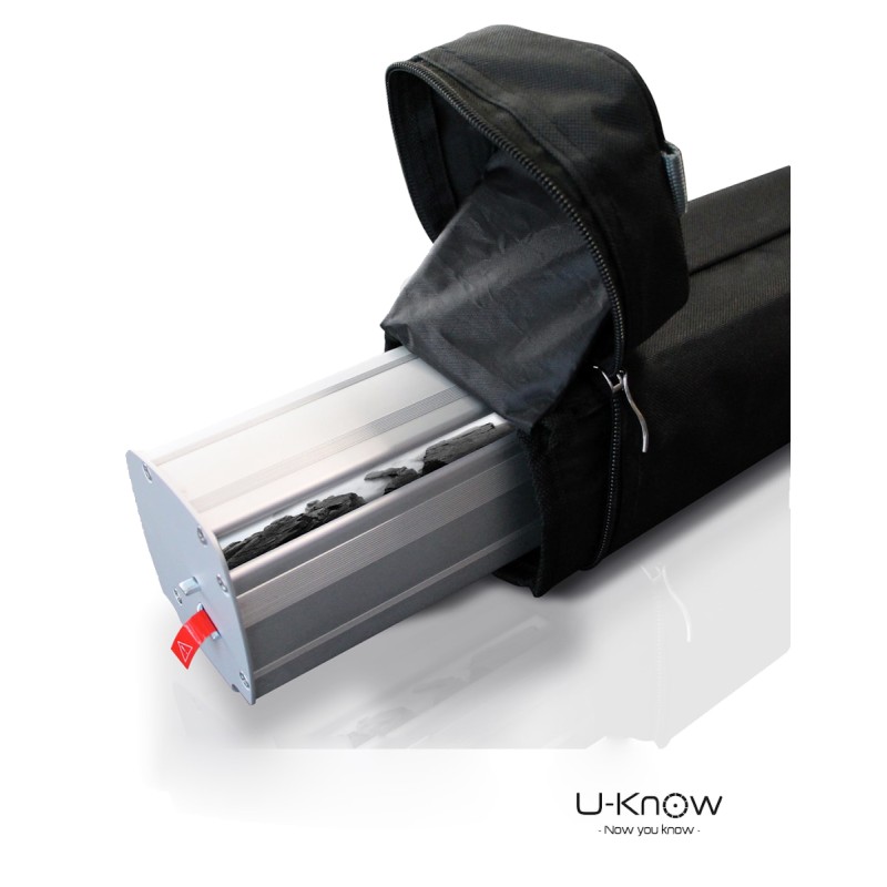 Kakémono de type rollup publicitaire et personnalisé. Structure de l'enrouleur en aluminium renforcée d’une plaque métal pour une meilleure stabilité. Fixation du mât renforcée. Affiche imprimée en France sur bâche PVC 440g/m² norme anti-feu européenne B1. Sac de transport en Oxford 300D avec protection intérieure.