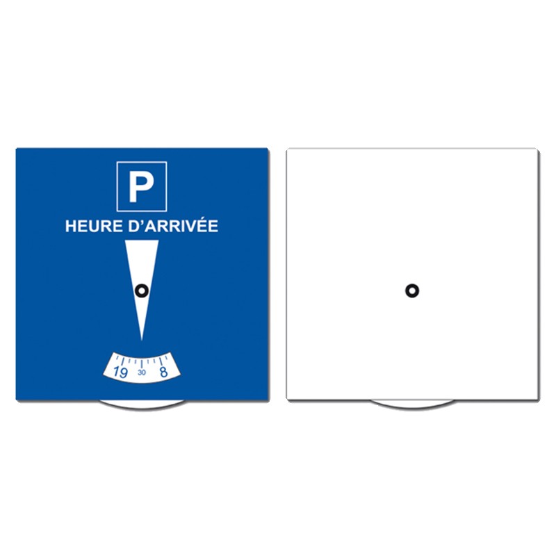 Disque de stationnement. Conforme à la nouvelle réglementation (décret 2007-1503 / arrêté du 06/12/2007). Recto bleu et verso blanc. Marquage au verso uniquement (interdit au recto), 1 couleur ou Quadri-Numérique.