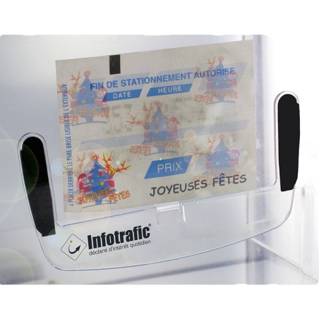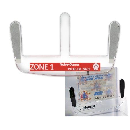 Support adhésif permettant de maintenir un ticket de parking, 1 carte ou autre sur le pare-brise d’une voiture. Par défaut, lecture du message publicitaire à l’extérieur. Marquage en 1 couleur ou plus.