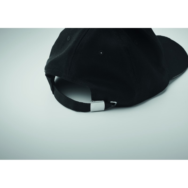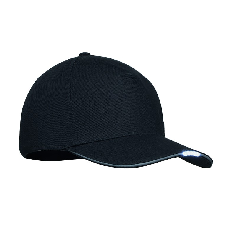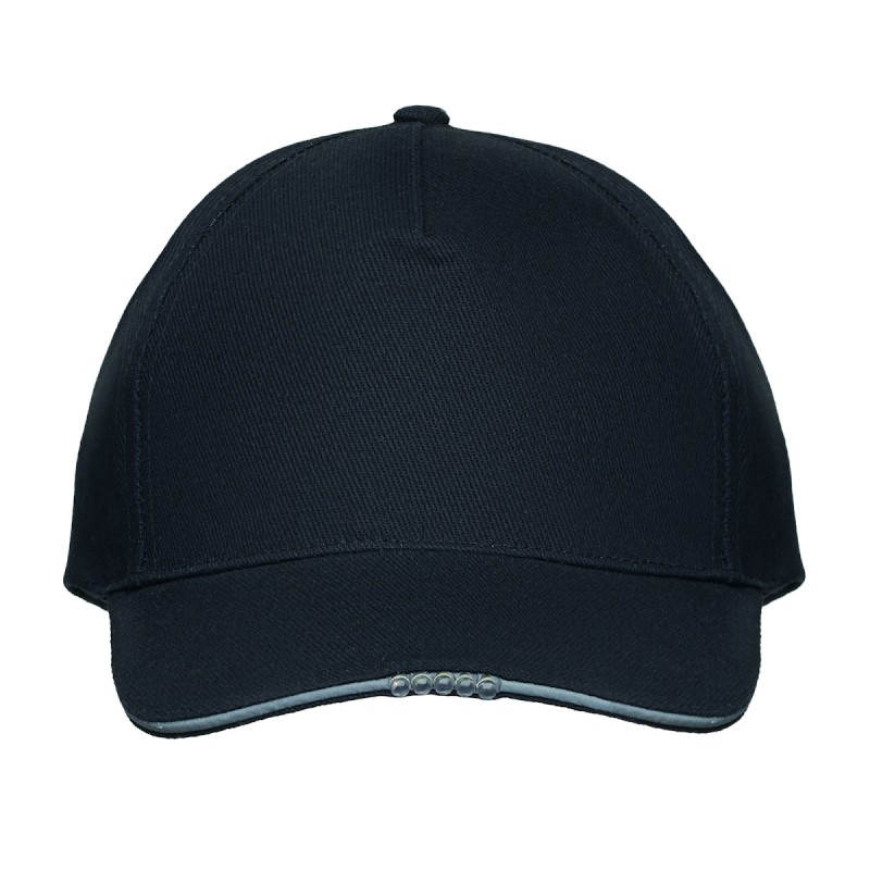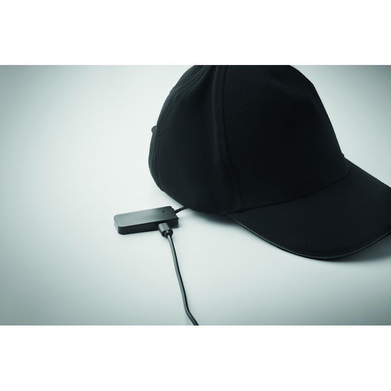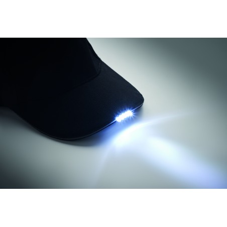 Ccasquette de baseball à 5 panneaux en coton 200gr/m² avec boucle en métal. Comprend une lumiere dans le sandwich et un câble de chargement USB.