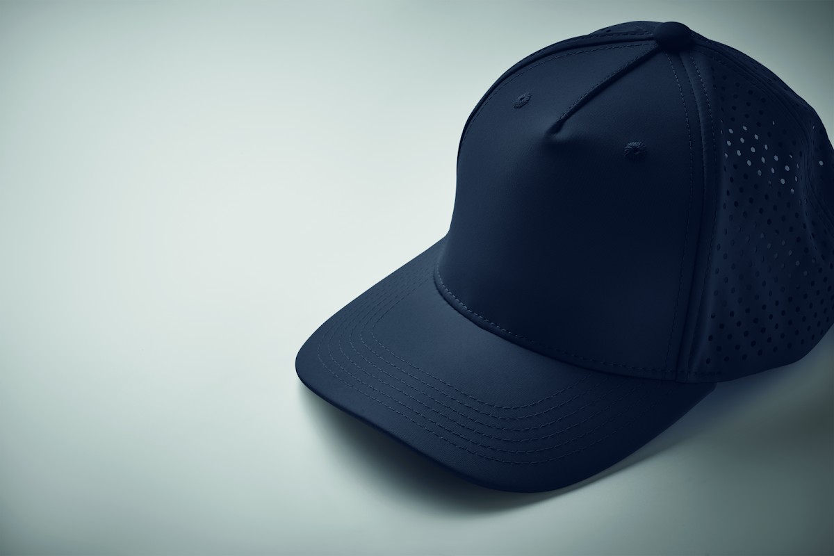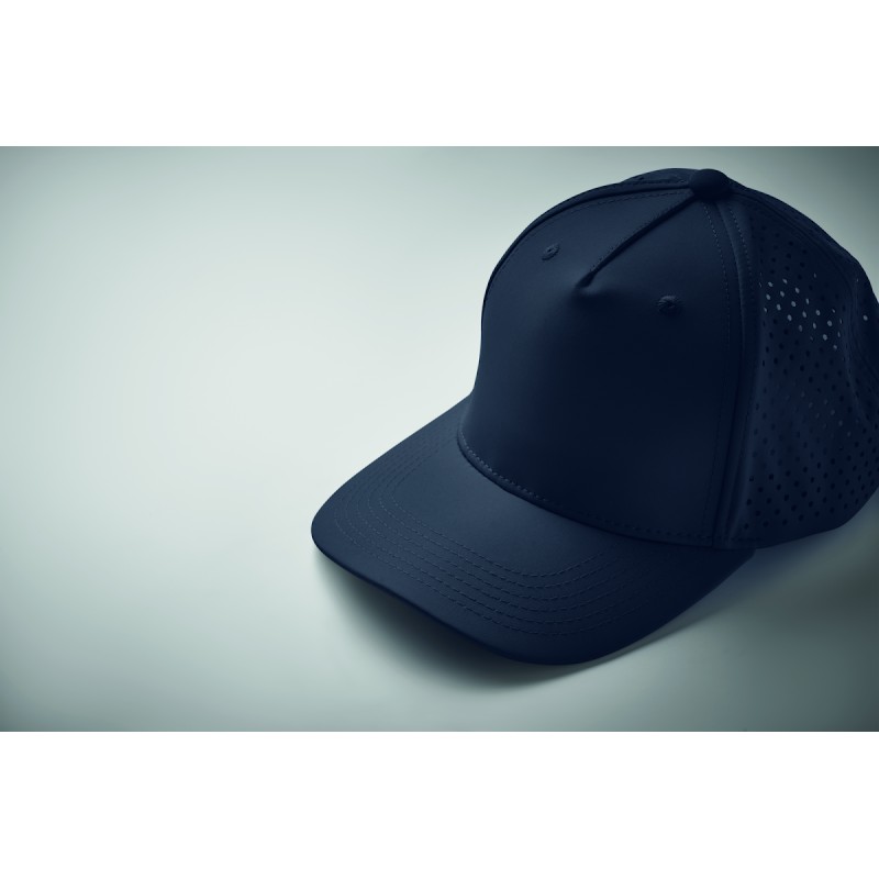 Casquette en polyester 5 panneaux avec fermeture auto-agrippante réglable. 4 panneaux perforés. Panneau avant avec 2 œillets cousus de couleur assortie. L'article sèche rapidement et est déperlant. 130 gr/m²