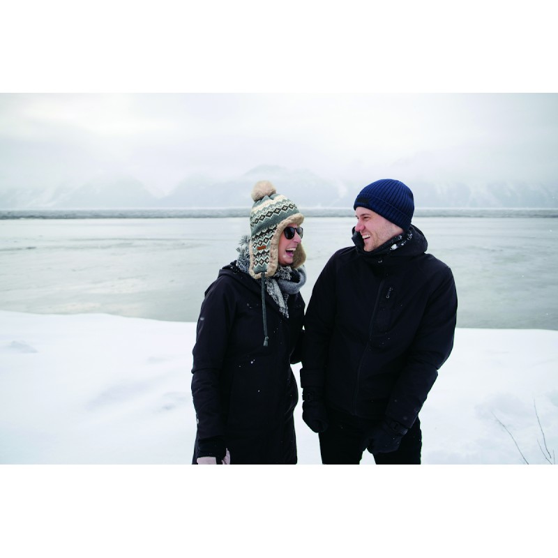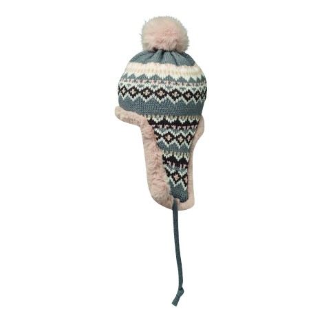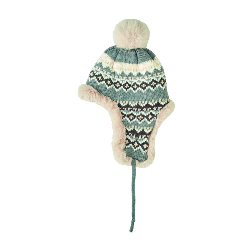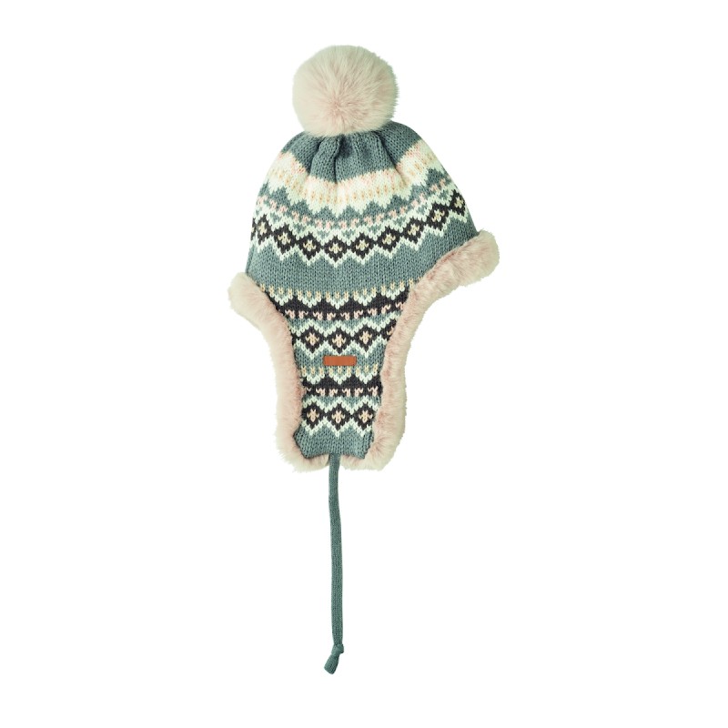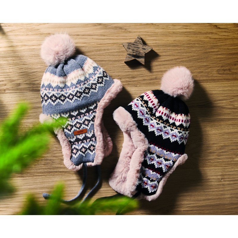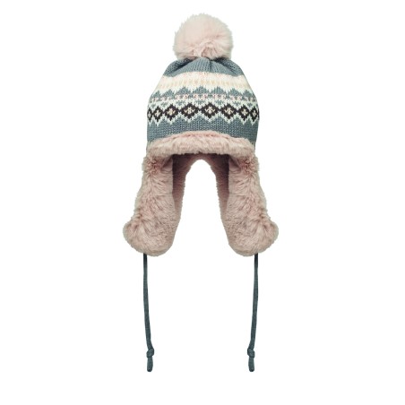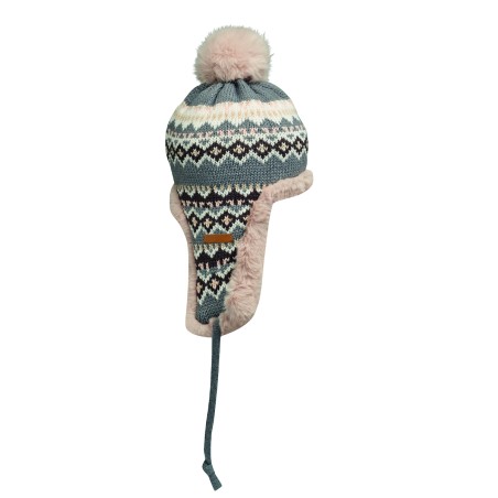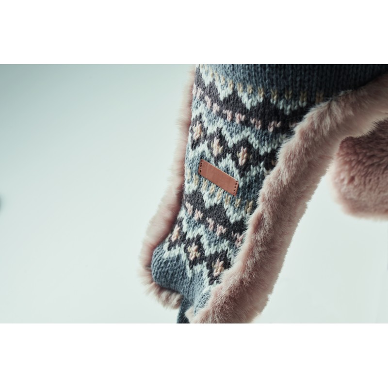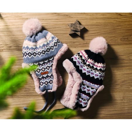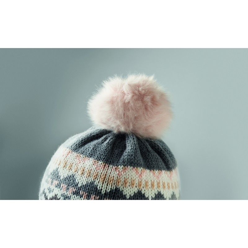 Bonnet tricoté avec oreillettes et pompon en fibre acrylique, doublé de polyester et de polaire. Comprend une étiquette pour la zone d'impression d'un côté. Taille adulte.