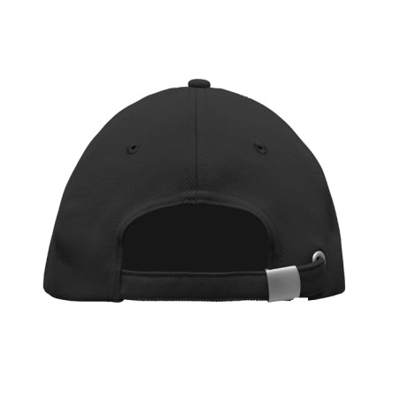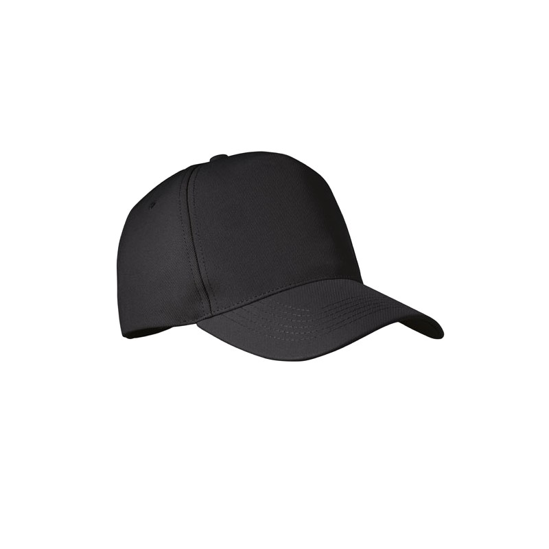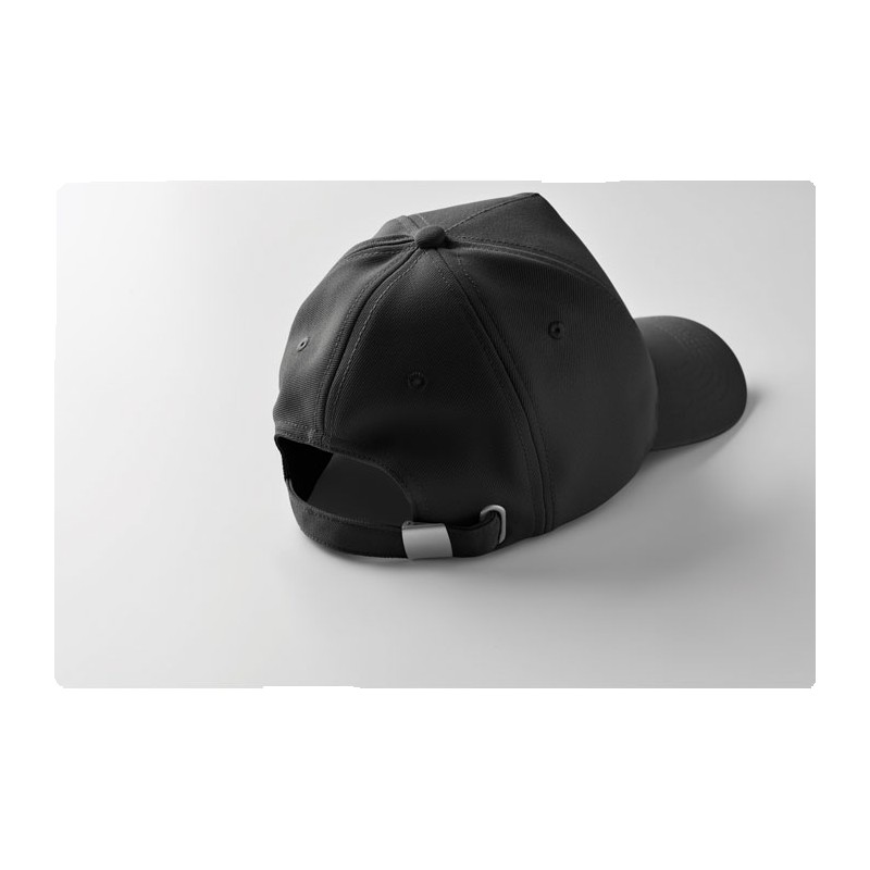 Casquette de baseball à 5 pans en polyester Rpet 210 gr/m² avec boucle en acier argenté. 4 œillets brodés de couleur assortie. Taille 7 1/4.