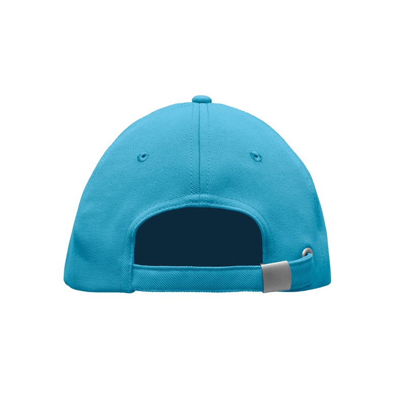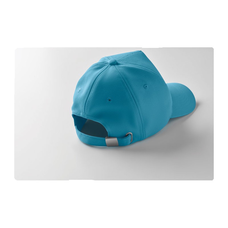 Casquette de baseball à 5 pans en polyester Rpet 210 gr/m² avec boucle en acier argenté. 4 œillets brodés de couleur assortie. Taille 7 1/4.