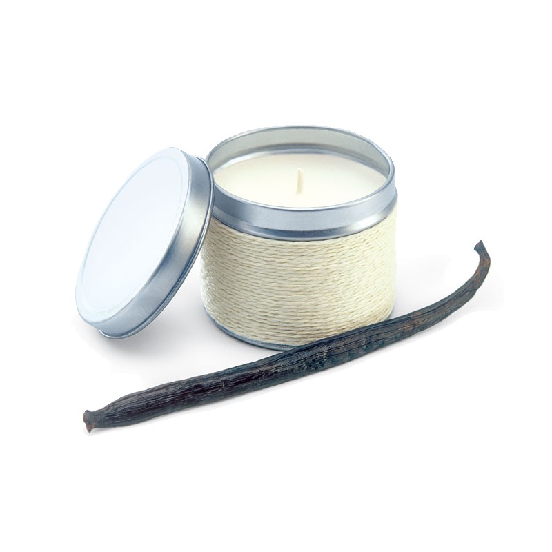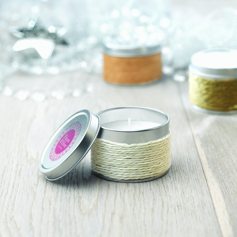 Bougie parfumée à base de cire végétale, 60 g, dans une boîte décorative en métal.