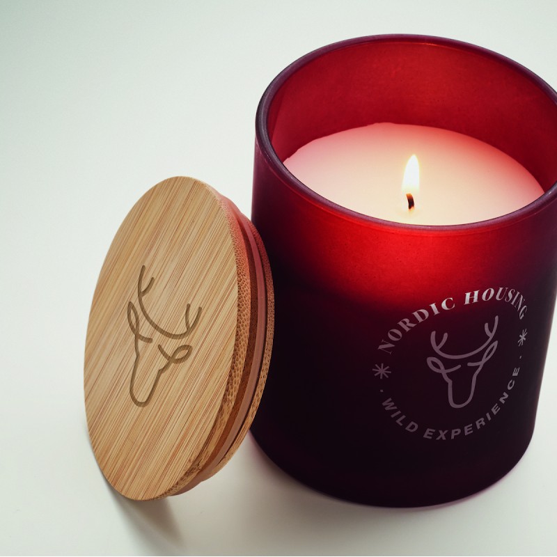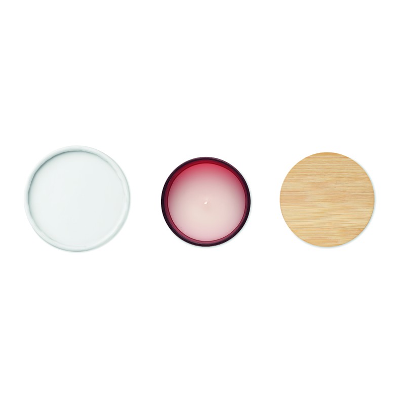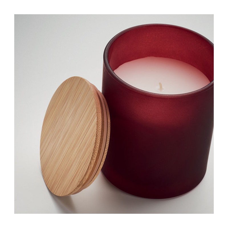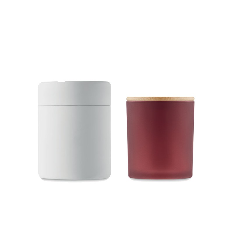 Bougie en cire végétale parfumée dans un support de pot en verre dépoli avec couvercle en bambou. 200 gr. Durée de combustion : 33 heures. Présentée dans une boîte cadeau en tube de papier. Le bambou est un produit naturel, et présente de légères variations de couleur, de décoration et de tailles.