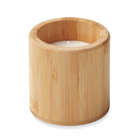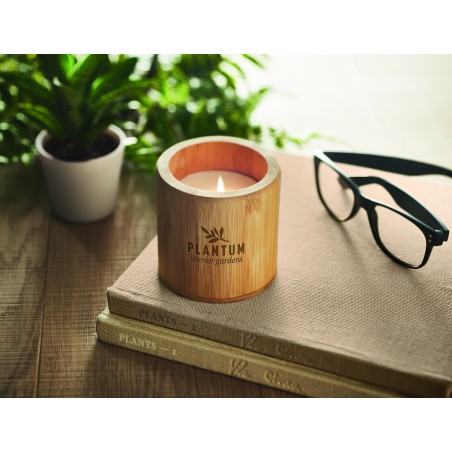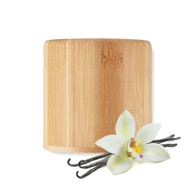 Bougie en cire végétale parfumée à la vanille dans un support en bambou. 160 gsm. Durée de combustion : 30 heures. Le bambou est un produit naturel, et présente de légères variations de couleur, de décoration et de tailles.160gr.