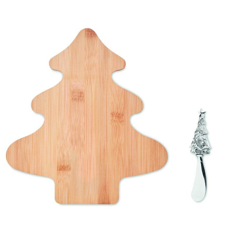 Set à fromages en bambou. Planche en forme sapin et couteau à fromage en acier inoxydable. Le bambou est un produit naturel, il peut y avoir de légères variations de couleur et de taille par article.