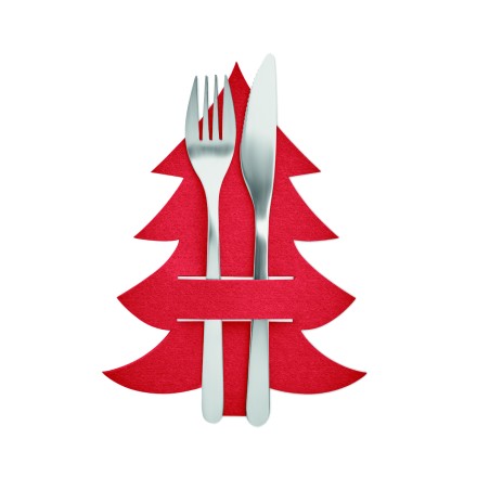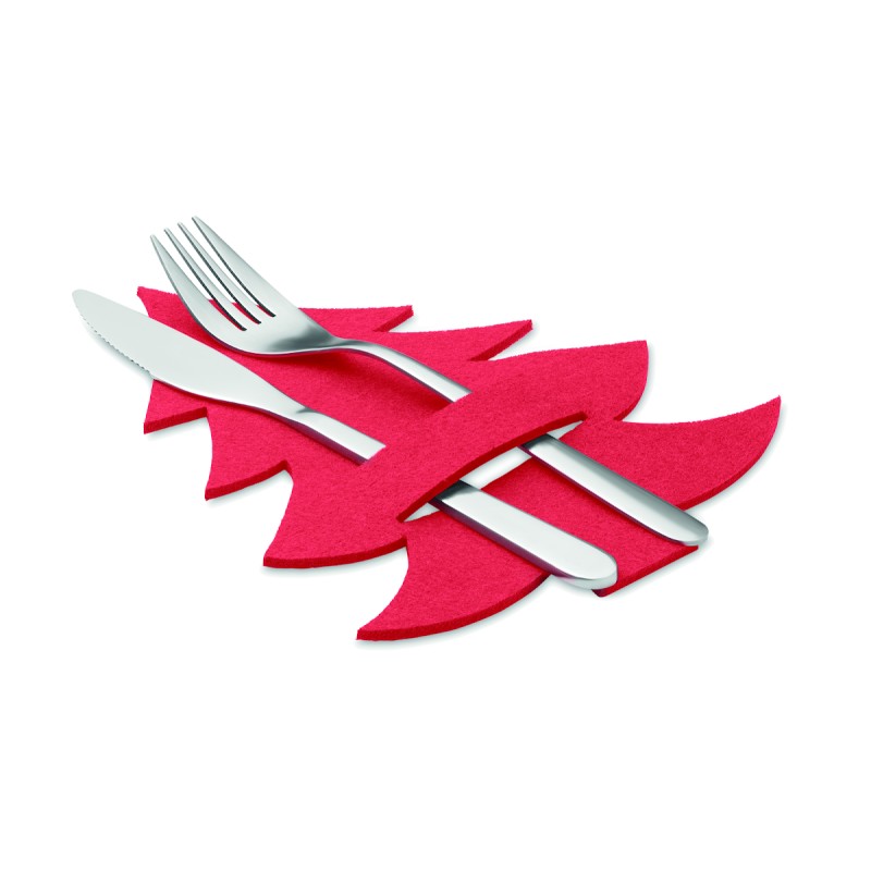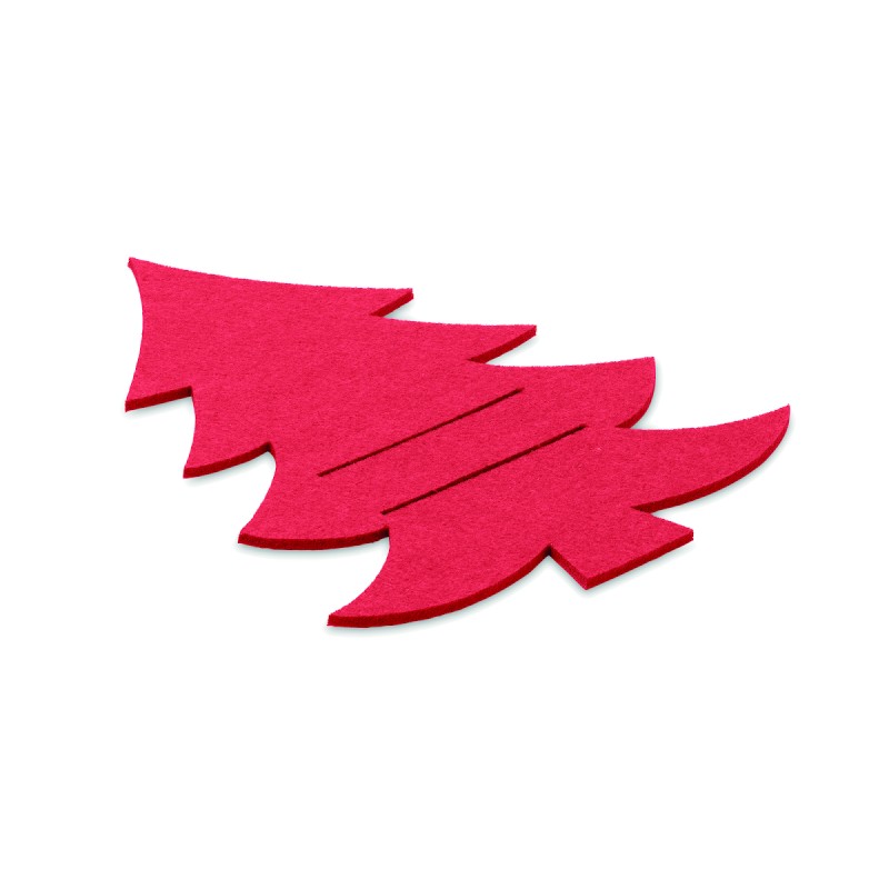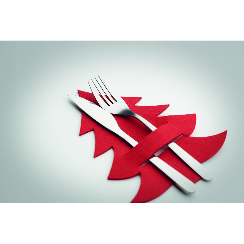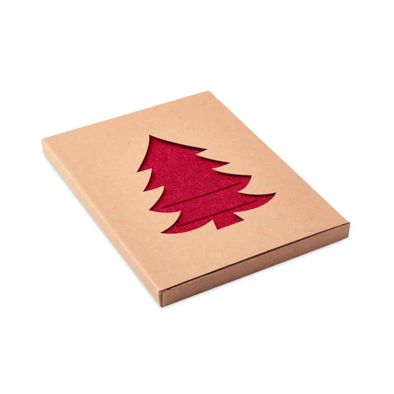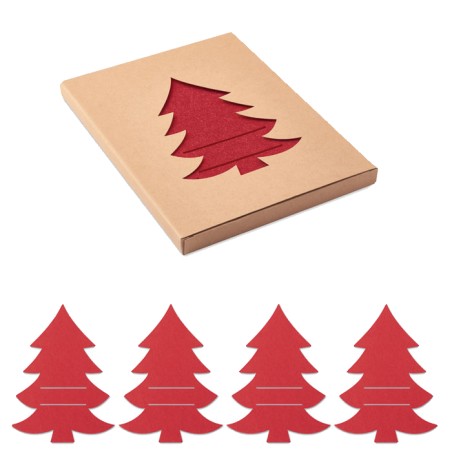 Lot de 4 porte-couverts en feutre RPET en forme de sapin de Noël présentés dans une boîte kraft.