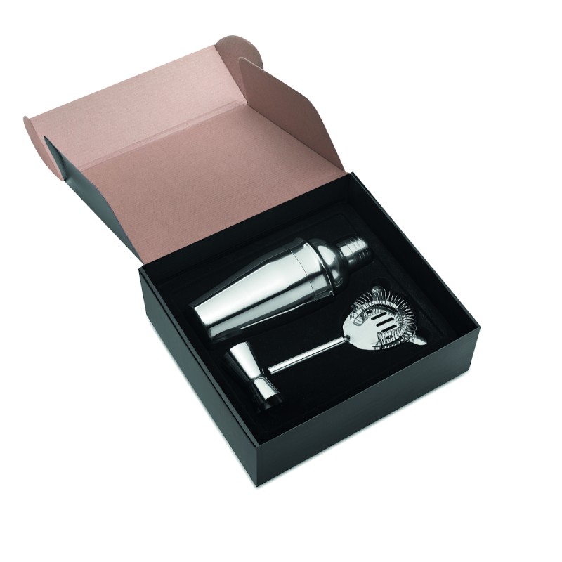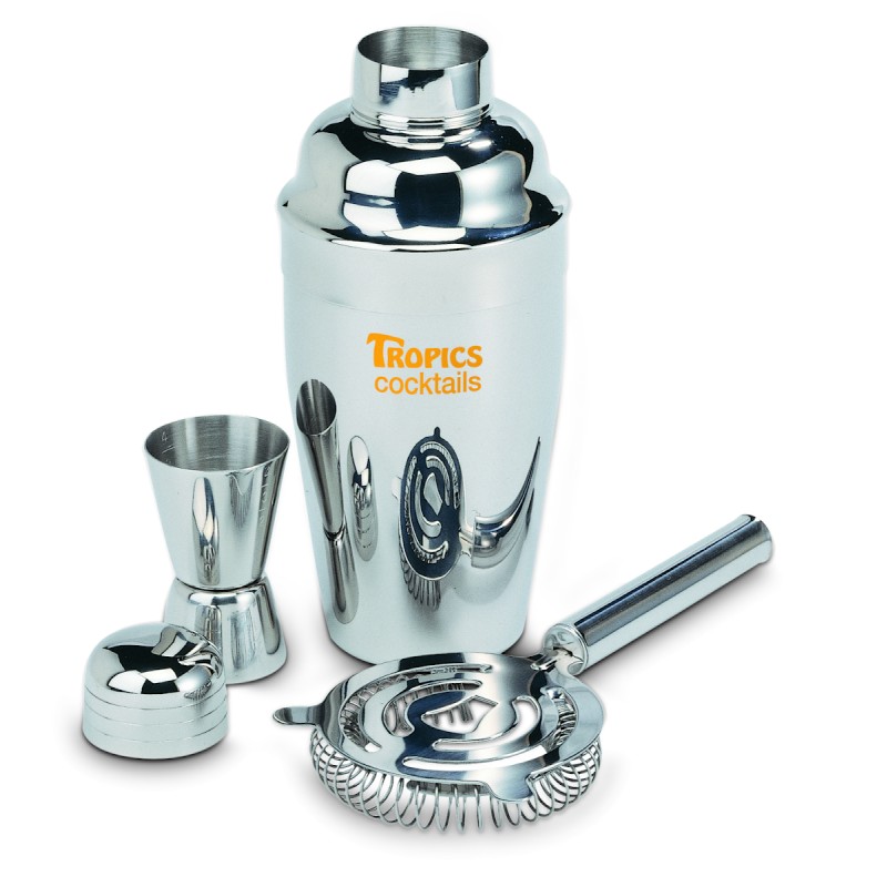 Set à cocktail de luxe avec shaker, verre à mesure en métal et petit tamis.